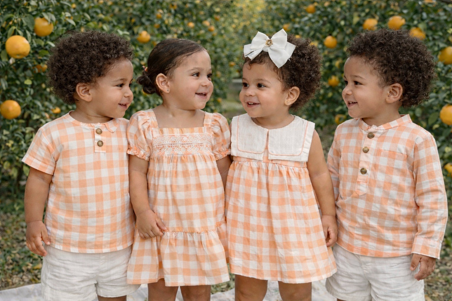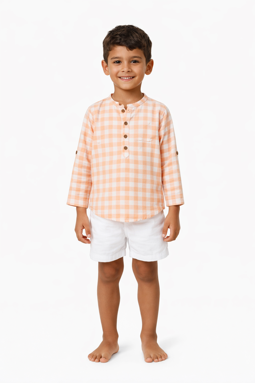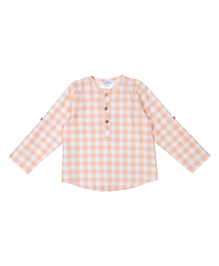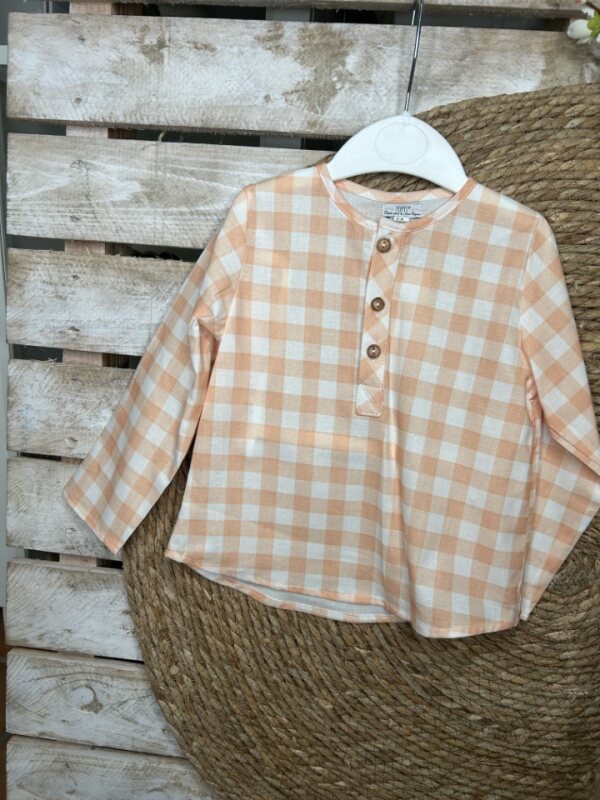 Camisa de manga larga en cuadros en tono melocotón y blancos. Diseño con cuello redondo y tapeta delantera con botones de madera que aportan un toque natural y elegante.