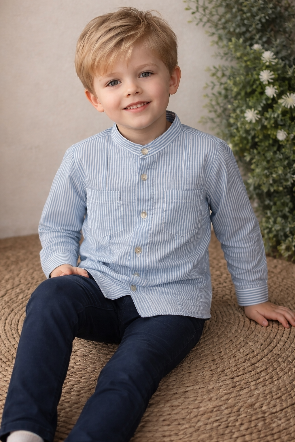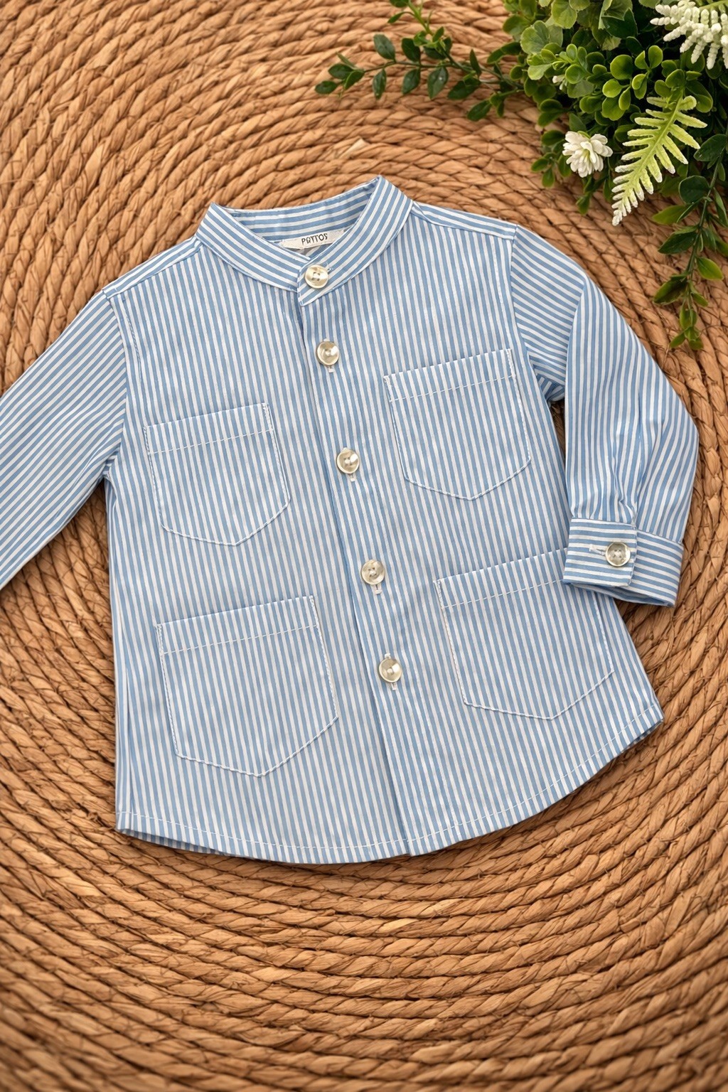 Camisa cubanita de rayas finitas en color celeste y blanco.