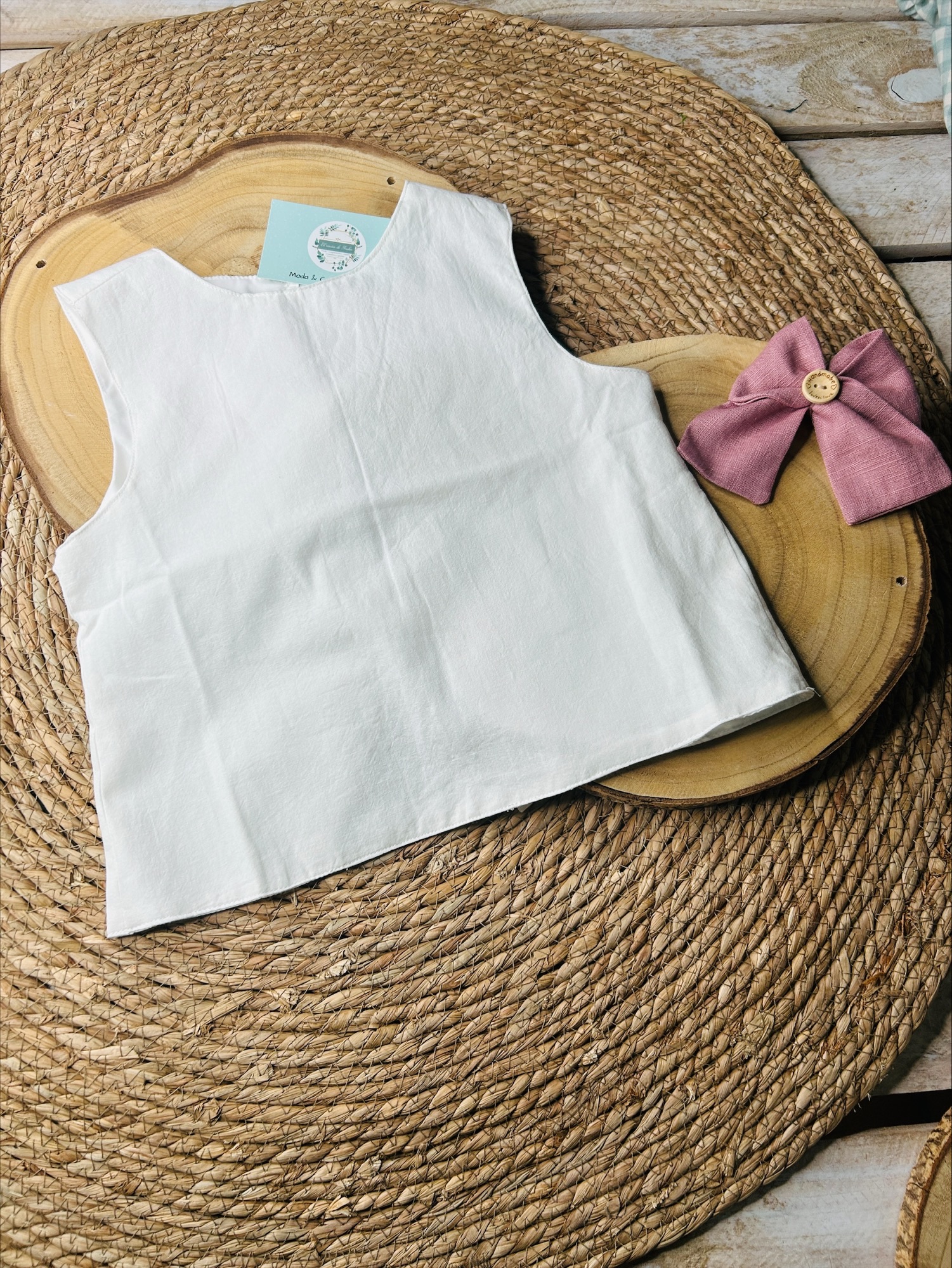 Camisa en tono blanco roto de lino con abertura en la parte trasera. Tiranta ancha y cuello redondo.