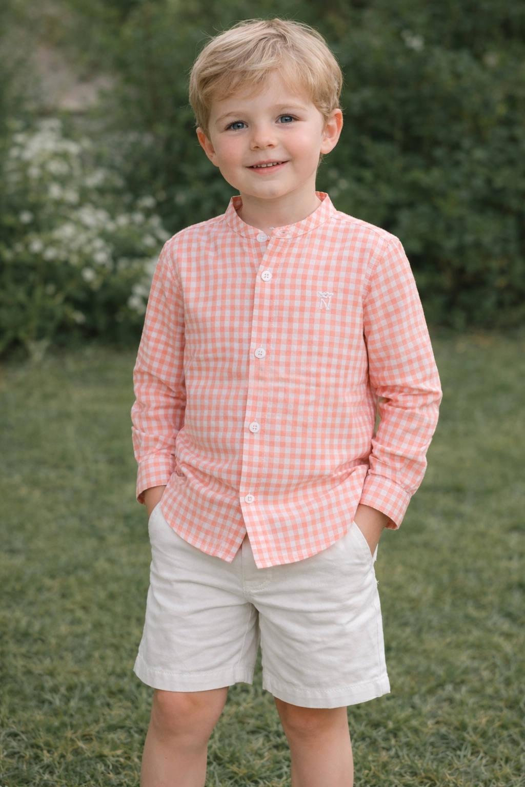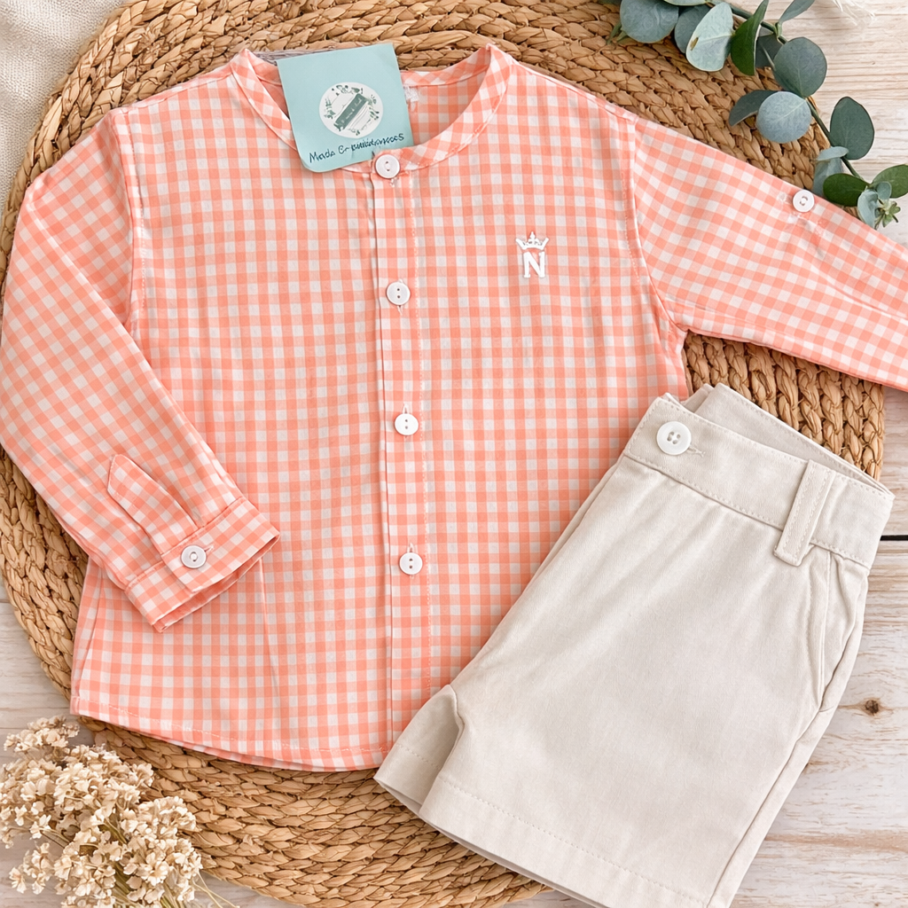 Camisa de manga larga de vichy en color mandarina y blanco.