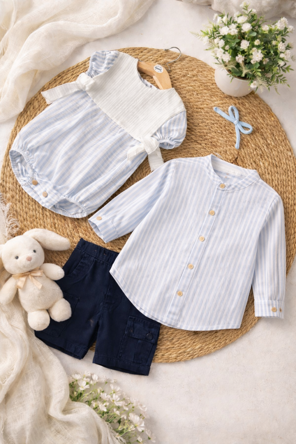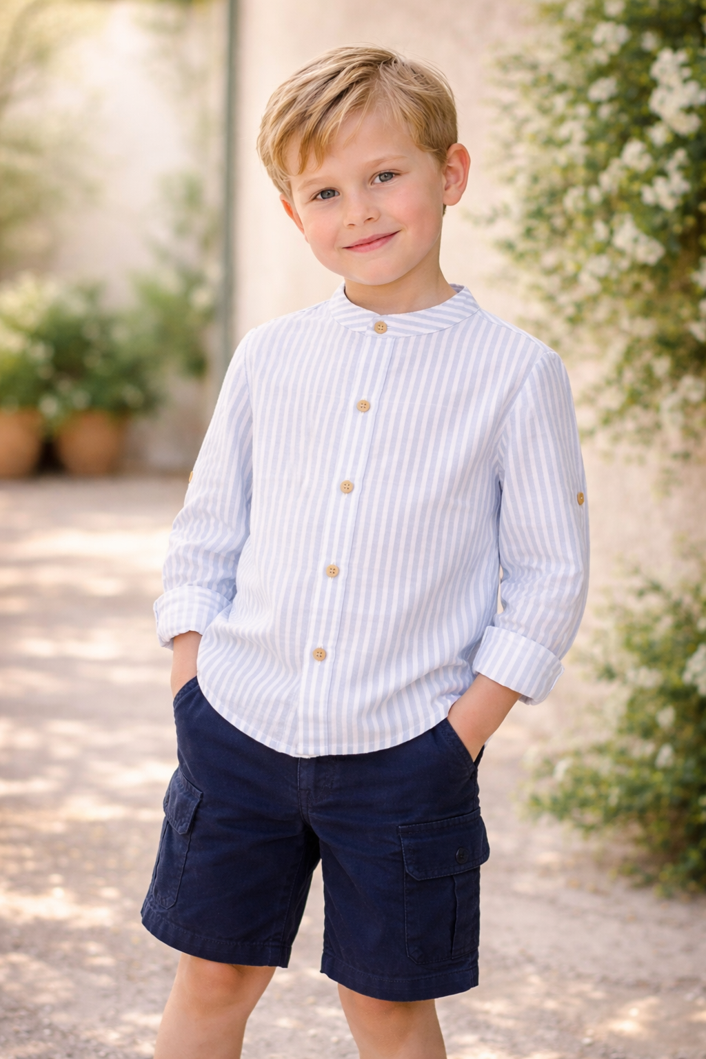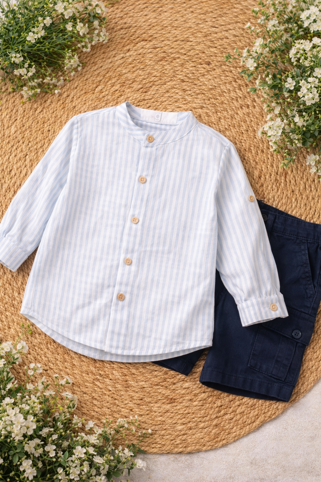 Camisa infantil de estilo atemporal confeccionada en suave tejido de rayas verticales en tono celeste y blanco. Su diseño limpio y elegante la convierte en una prenda versátil, perfecta tanto para looks más arreglados como para el día a día.