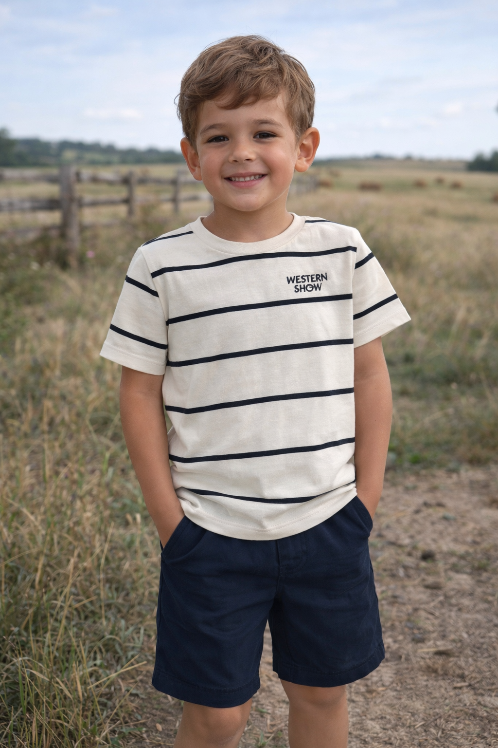 Camiseta de manga cortas con rayas en azul marino con fondo blanco roto.