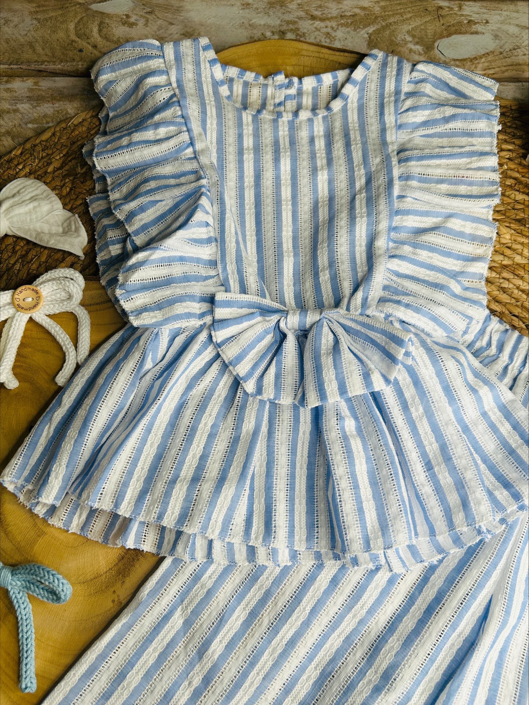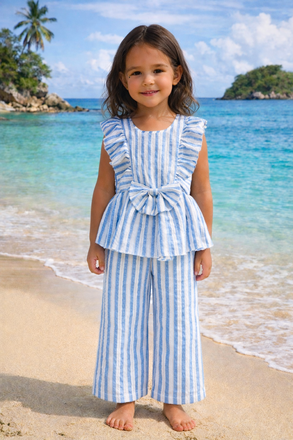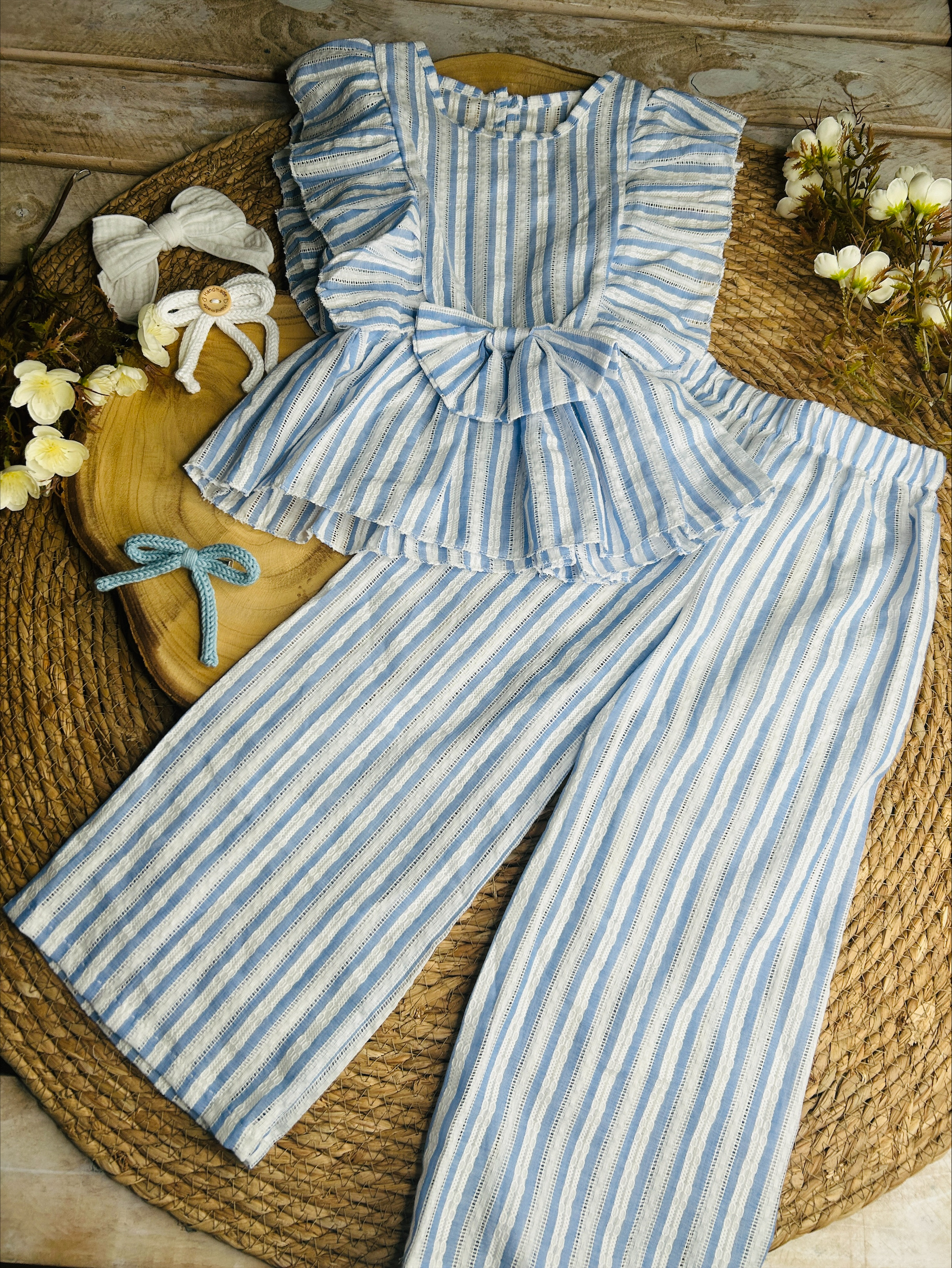 Conjunto de dos piezas compuesto por camisa y pantalón palazzo en estampado de rayas celeste y blanco.