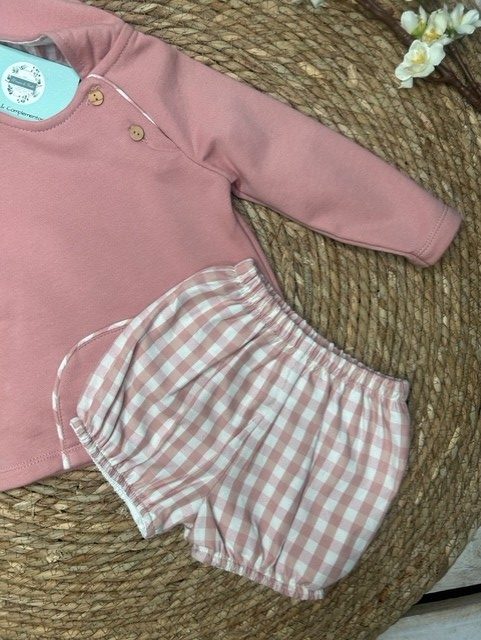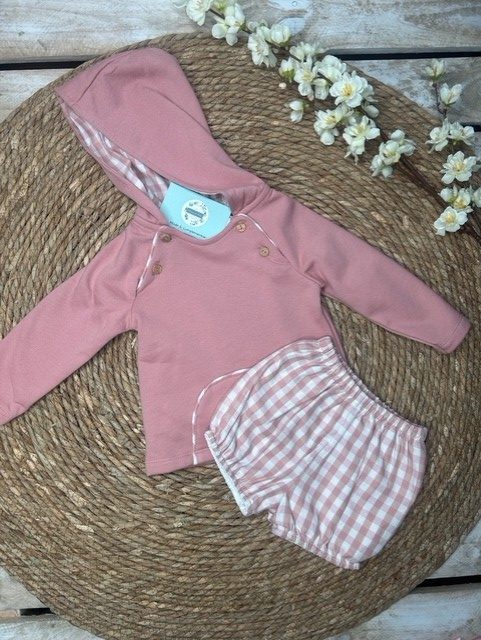 Conjunto de sudadera afelpada rosa con capucha forrada en vichy, bolsillo canguro y botones decorativos.