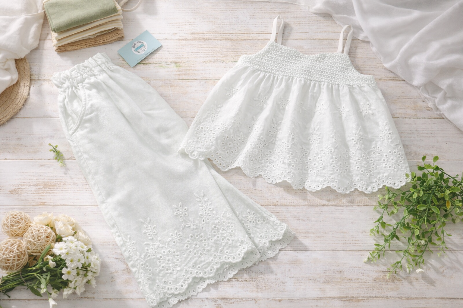 Conjunto de dos piezas compuesto por top de tirantes finos perforado y pantalón del mismo color de pata ancha perforado. Cinturilla de elástico.