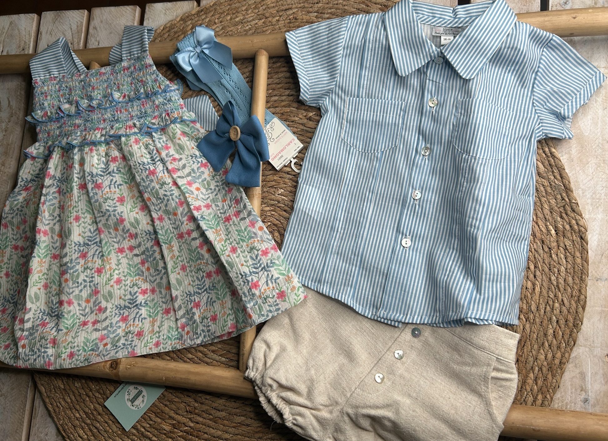 Conjunto de dos piezas compuesto por camisa tipo cubanita con manga corta de rayas en azul y blanco.