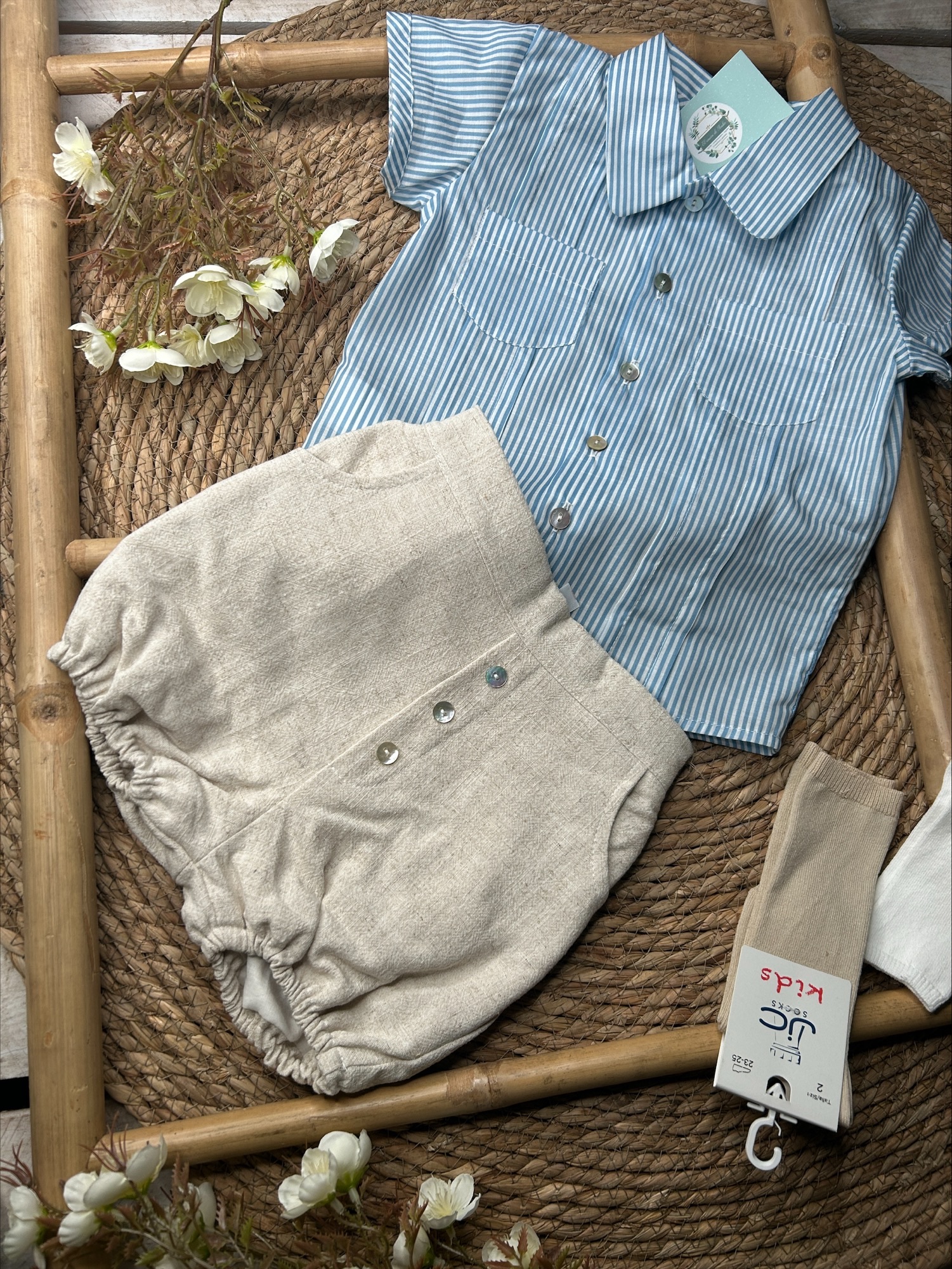 Combinado con cubre pañal de lino en beys. Cinturilla de elástico.