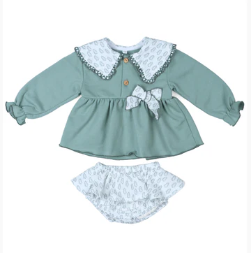 Conjunto bebé niña verde con cuello y lazo estampado.