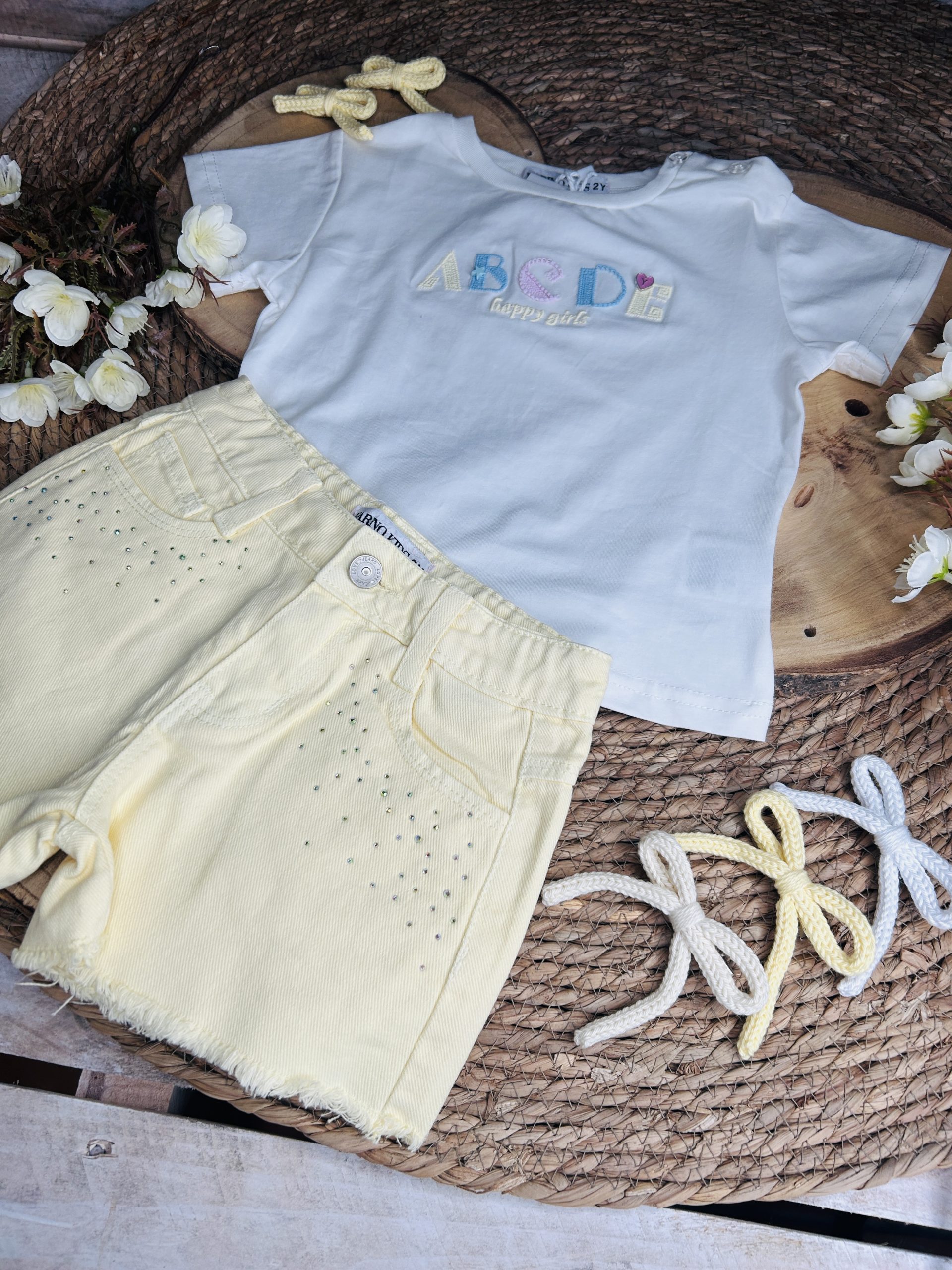 Conjunto de dos piezas para niñas compuesto por camiseta de manga corta blanca con letras de colores en tonos pasteles y pantalón corto desflecado vaquero en color amarillo pastel