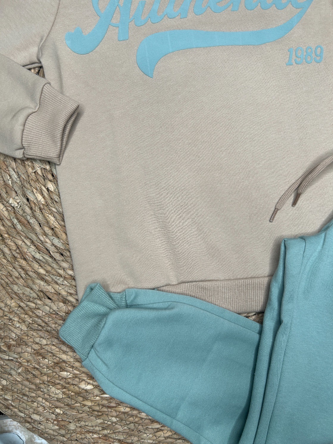 Conjunto de dos piezas compuesto por sudadera en color beys tostado y letras en color verde agua.