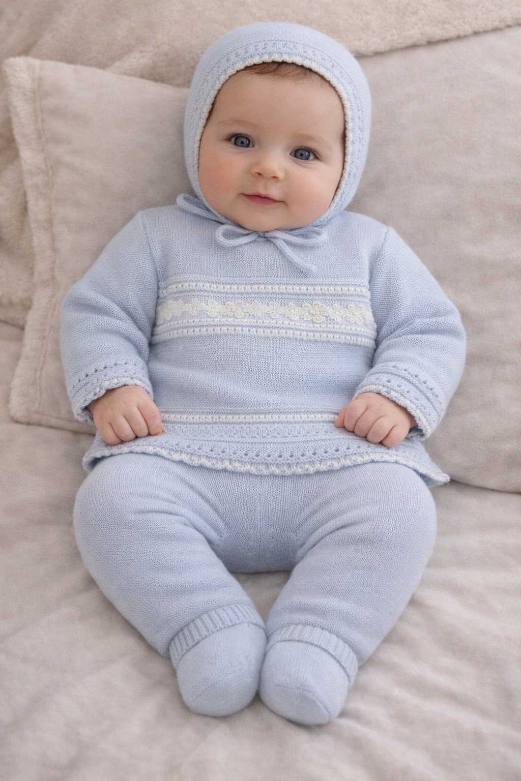 Precioso conjunto de punto para bebé en tono celeste, ideal para primeras puestas.