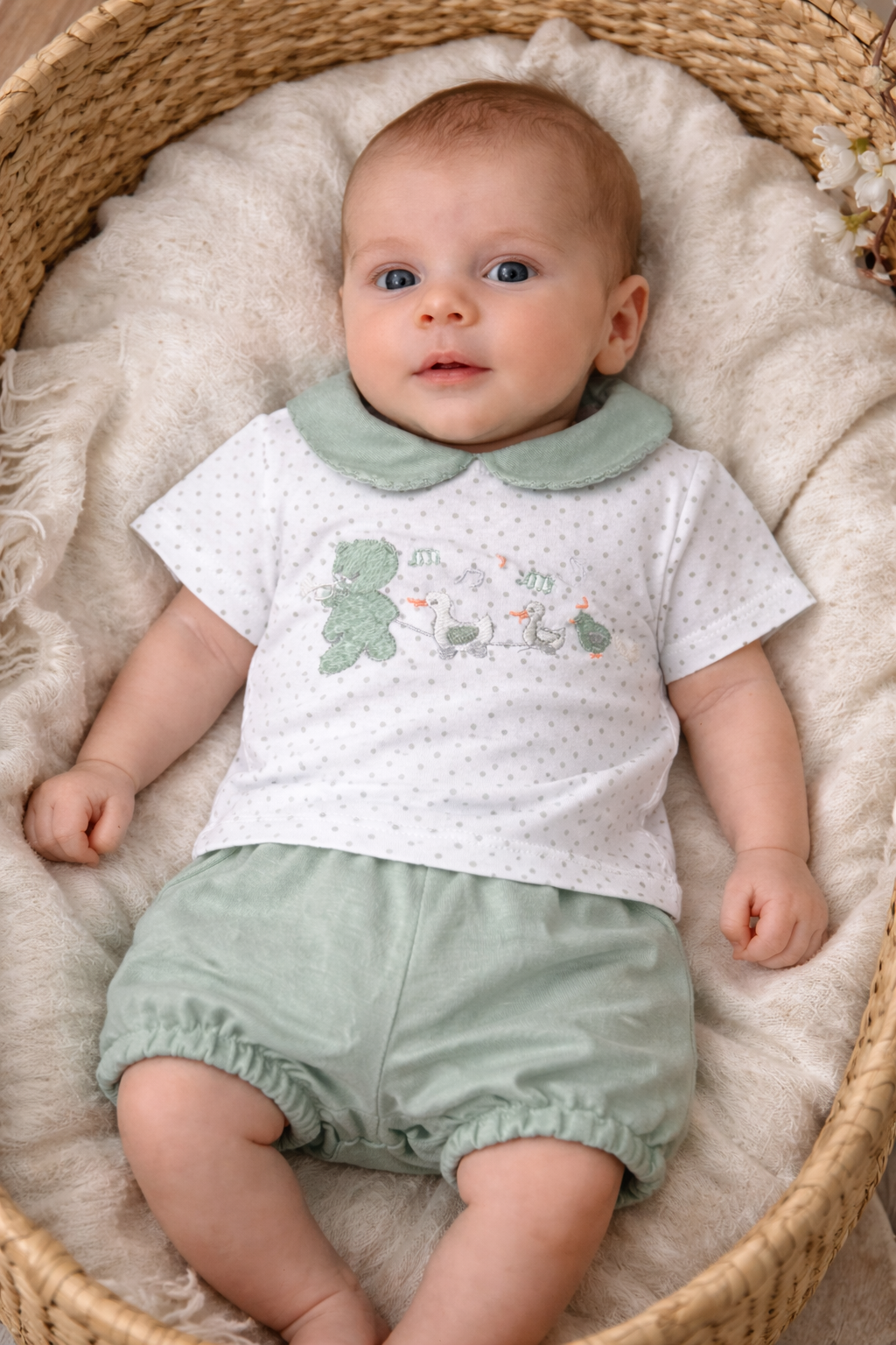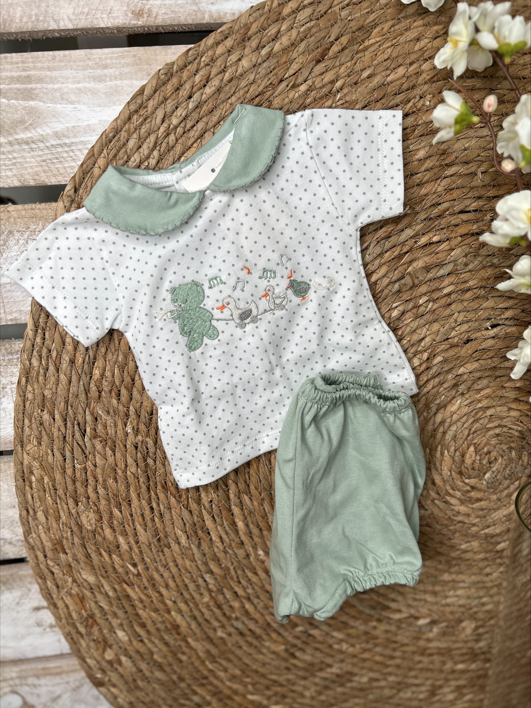 Compuesto por camiseta de manga corta con cuello bebé. Dibujo delantero bordado.