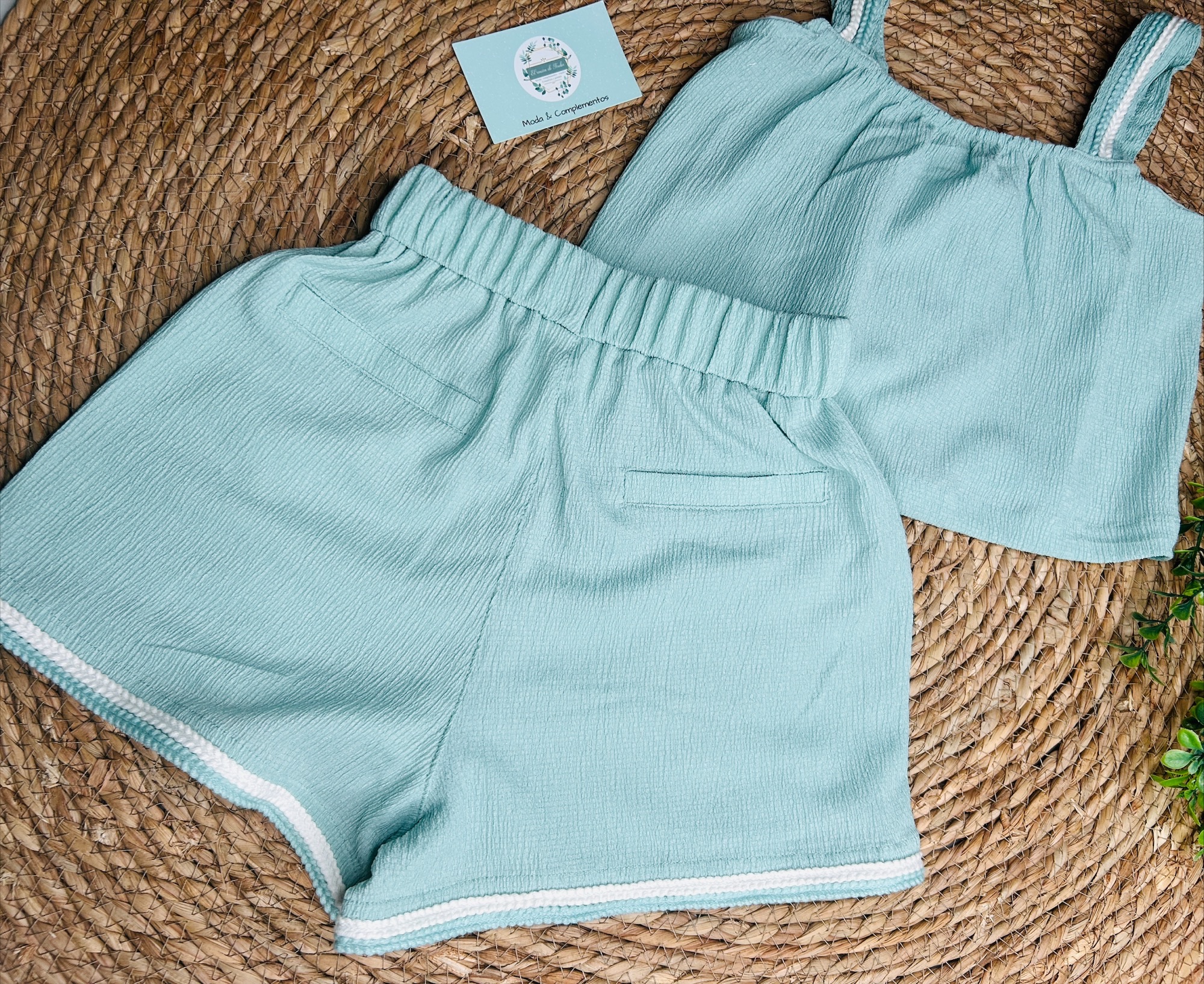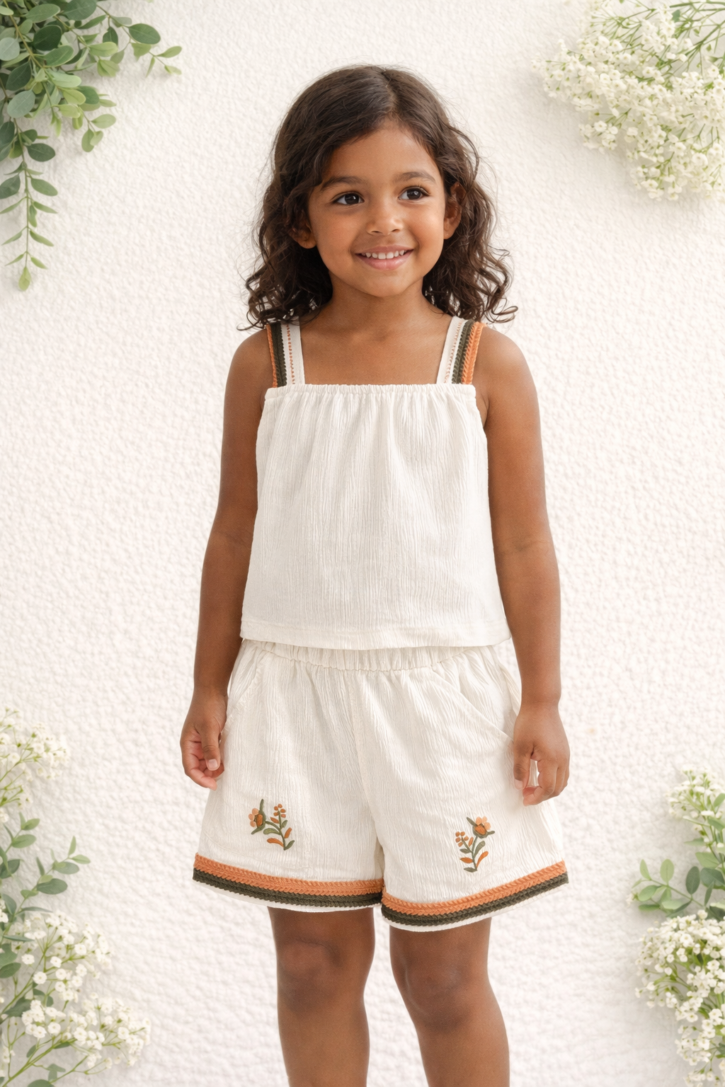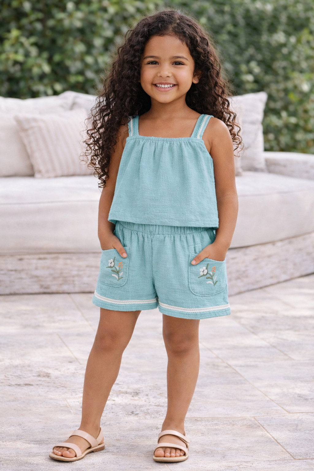 El top presenta tirantes con detalles que aportan un toque diferente. Short de cintura elástica para mayor comodidad, incluye bordados florales y acabado en el bajo con cenefa, creando un conjunto dulce y muy estiloso. Perfecto para looks diarios o para ocasiones especiales de verano.