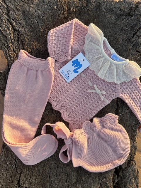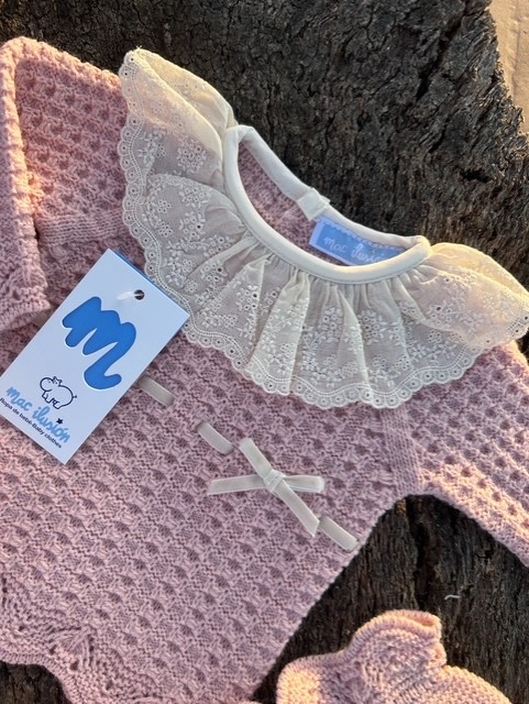 Jersey con cuello de volante con encaje en color natural y lazo de terciopelo.