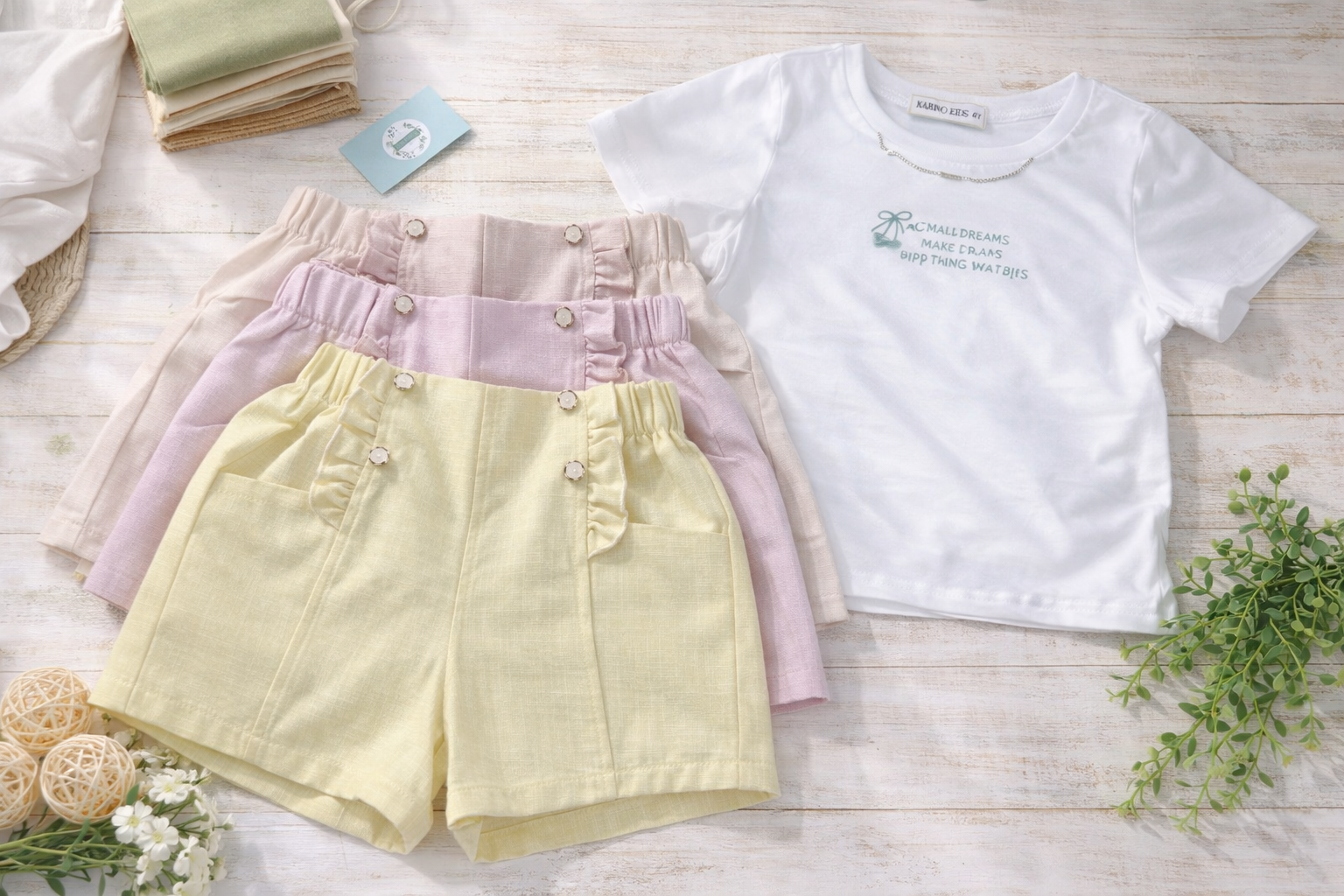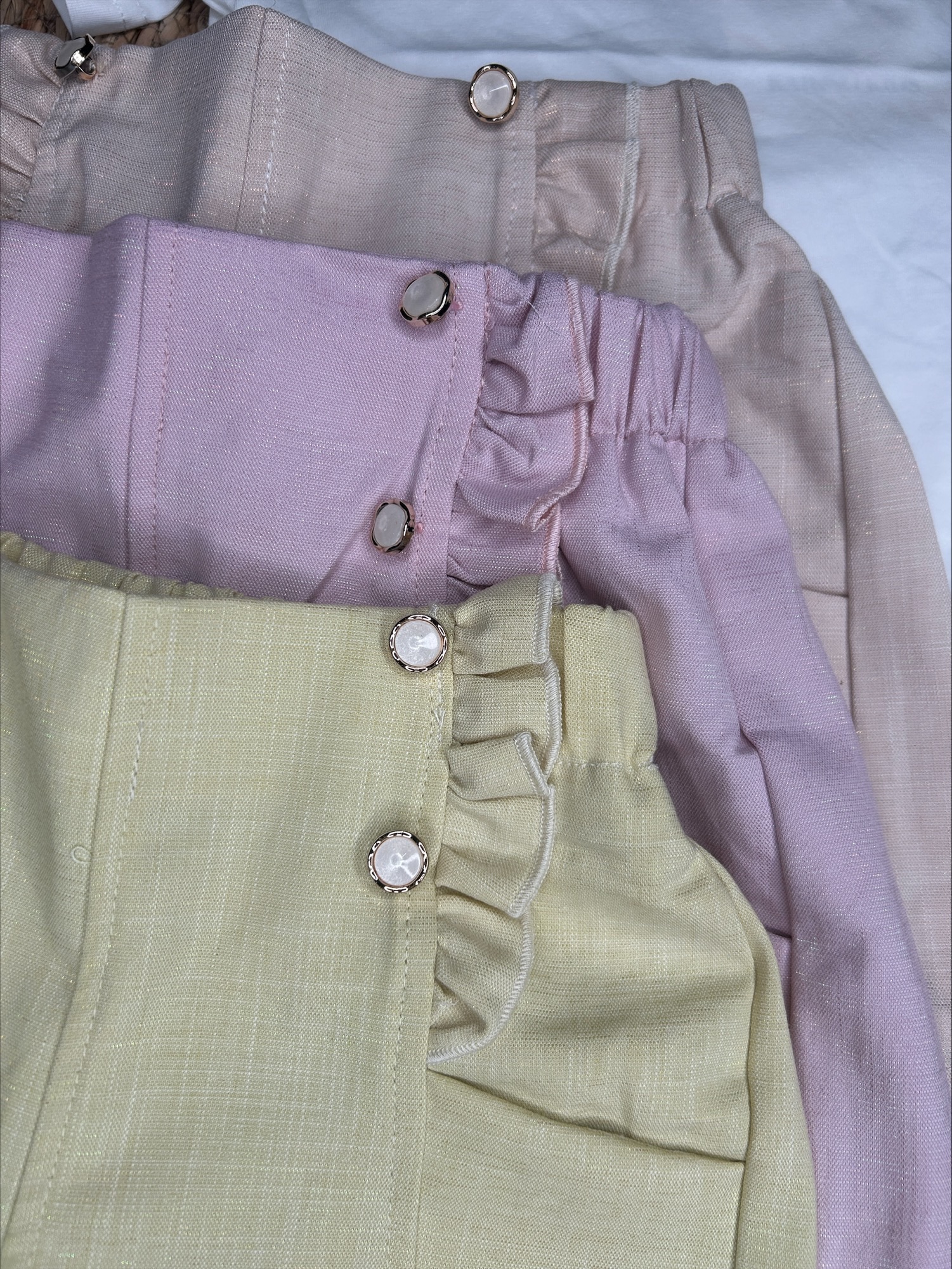 El short disponible en varios colores ( amarillo lima, rosa empolvado y beige), destaca por su tejido, su cintura elástica y sus botones en la parte frontal, además de un pequeño volante que añade un toque femenino y elegante.