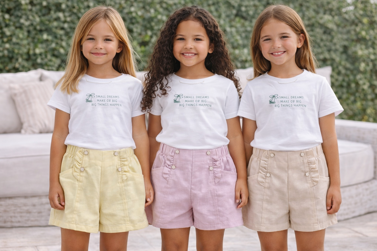 Conjunto de dos piezas compuesto por camiseta blanca de manga corta y short tipo lino en tonos suaves. Una combinación perfecta entre comodidad y estilo para los días de verano. La camiseta presenta un diseño sencillo con detalle decorativo en el cuello tipo cadenita y letras delanteras que aporta un toque moderno.