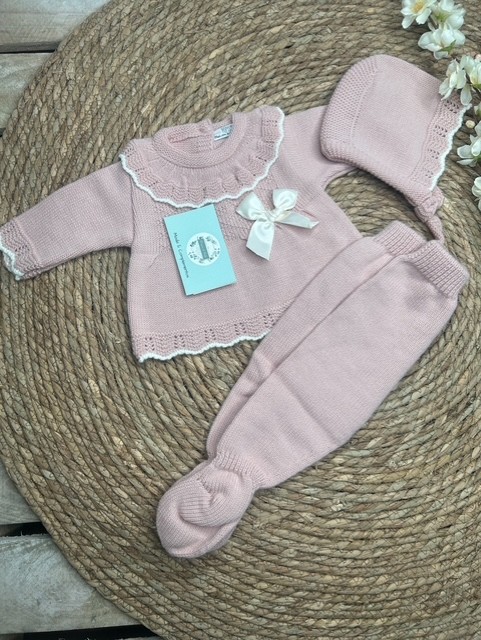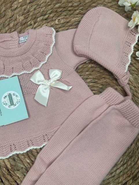 Conjunto de lana de tres piezas en rosa empolvado. Jersey con cuello de pequeño volante.