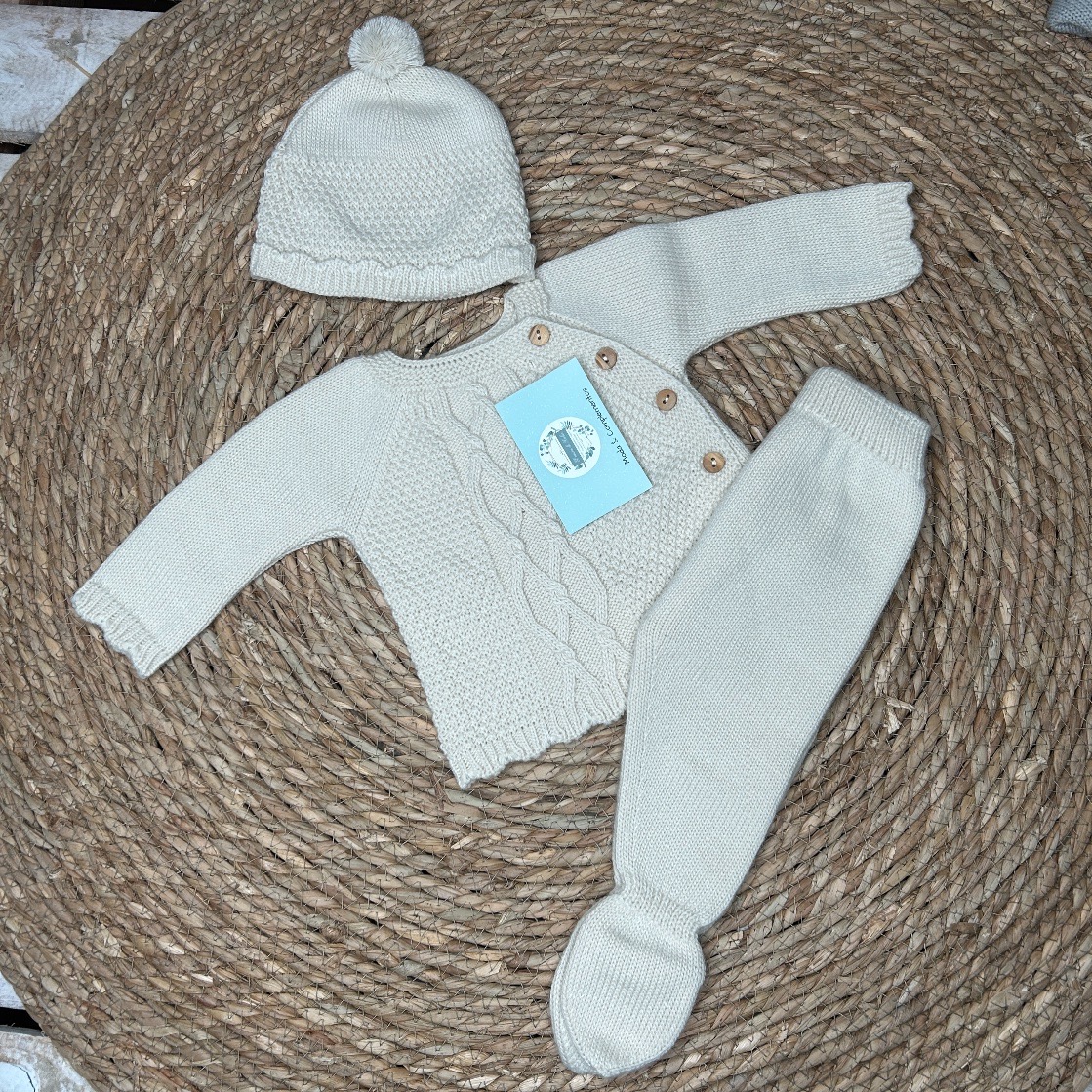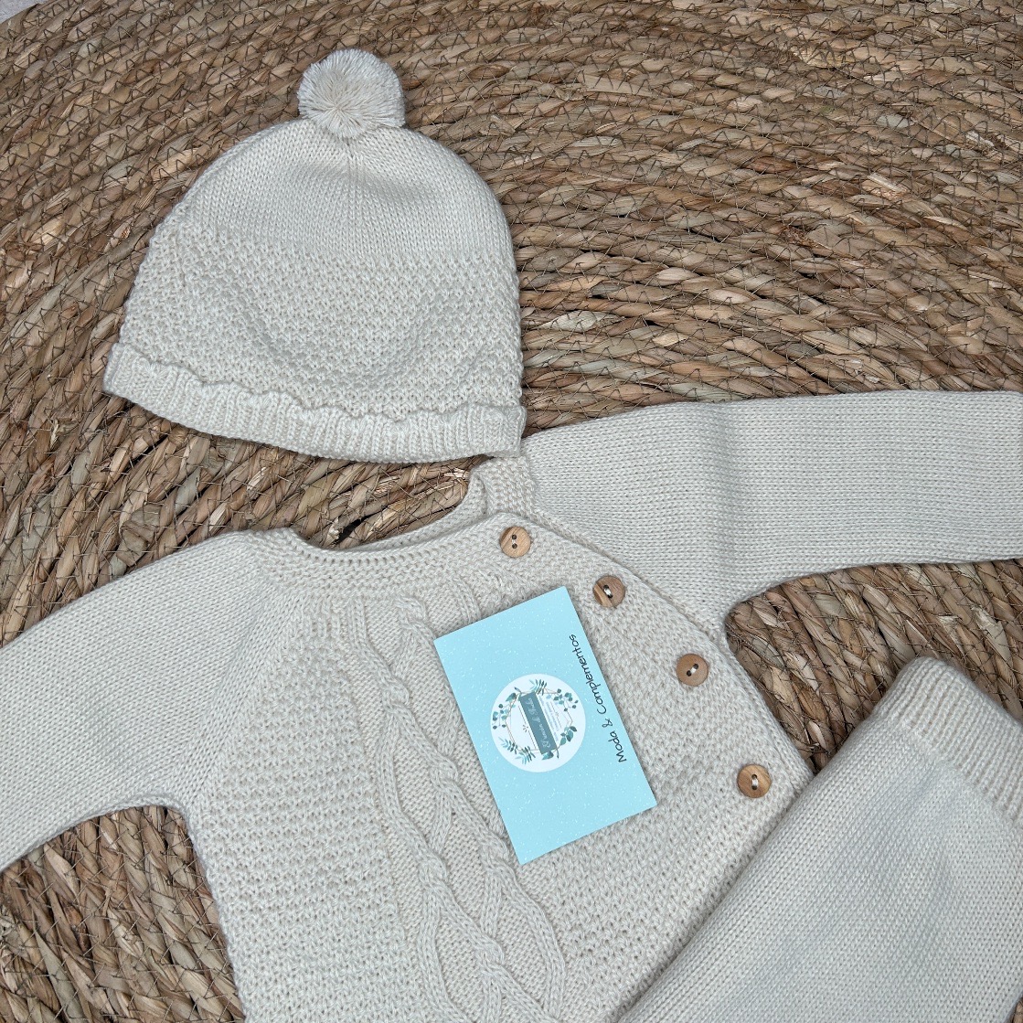 Conjunto de tres piezas de lana en color crudo, jersey con botones delanteros de madera. Polaina y gorro con pompón a juego.