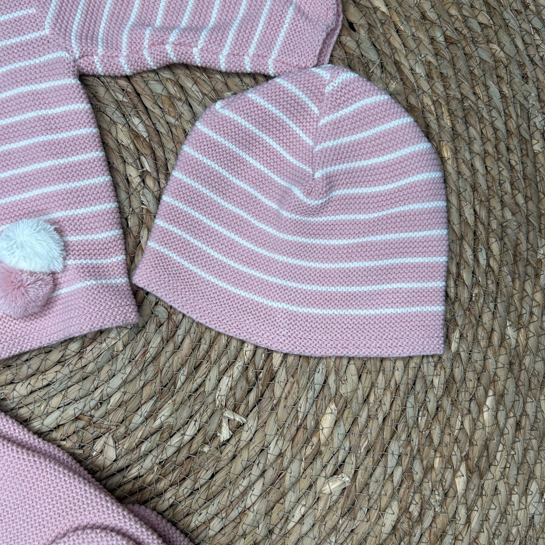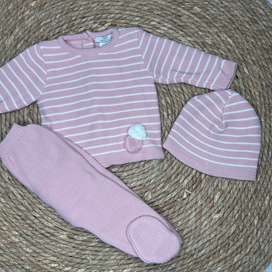 Conjunto de lana de tres piezas compuesto por jersey en rosa empolvado de rayas, abotonado en la parte trasera.