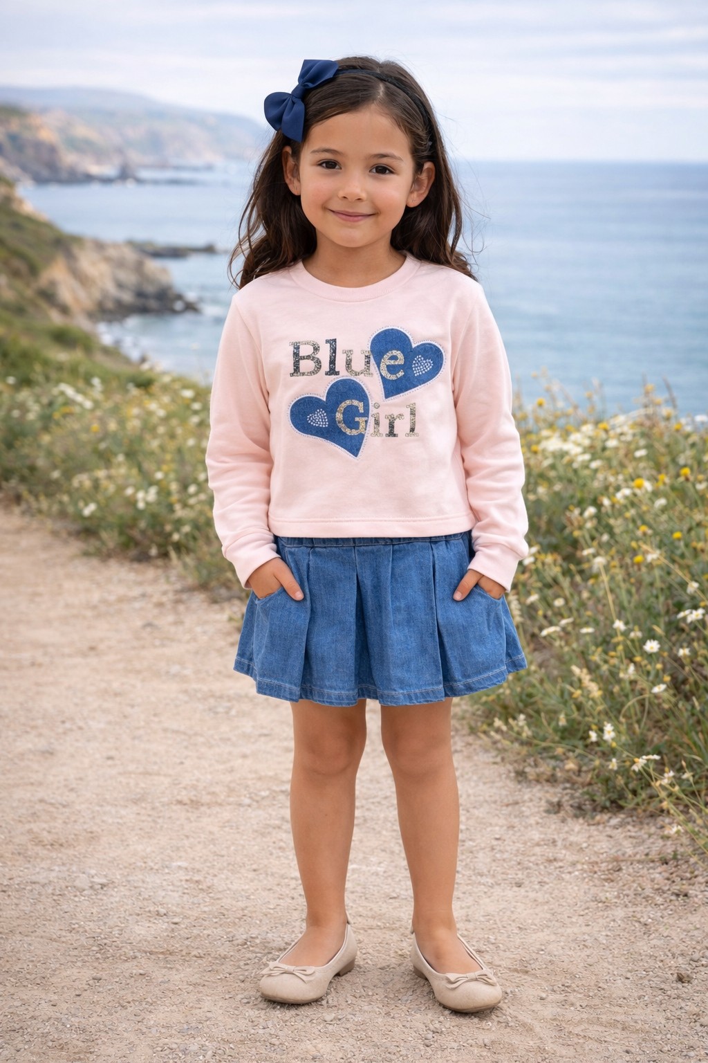 Sudadera infantil de manga larga en color rosa bebe, estampado frontal con corazones en tonos azules y letras, que aporta un toque moderno y divertido al diseño.