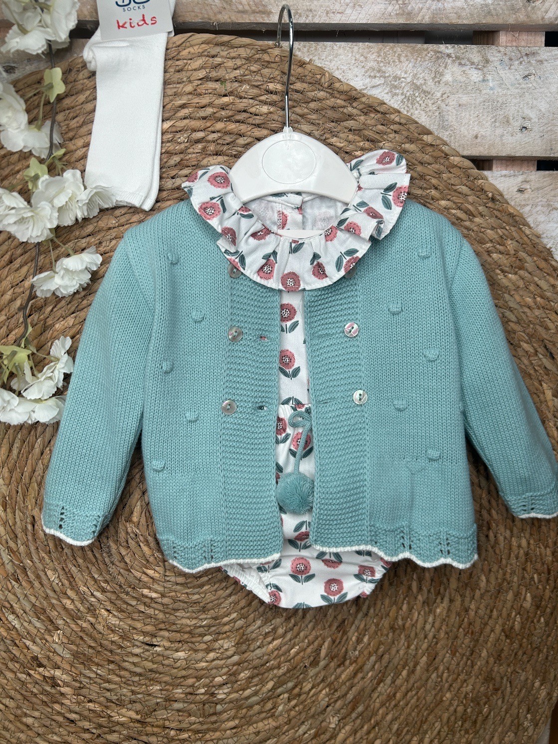 Conjunto de tres piezas compuesto por camisa estampada y con cuello volante.