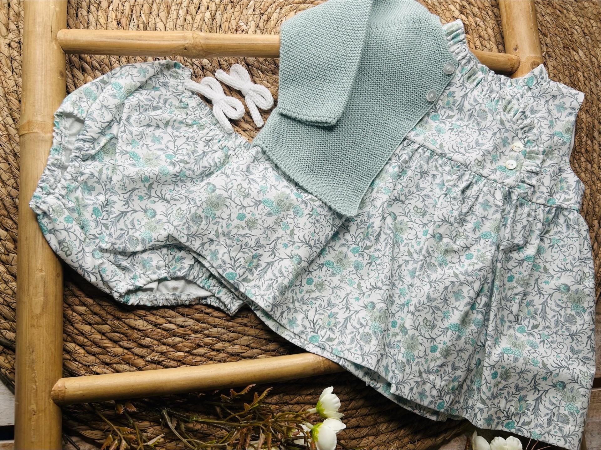 Jesusin estampado floral en tonos verdes y grisáceos. Sin mangas y abotonado en la parte trasera.