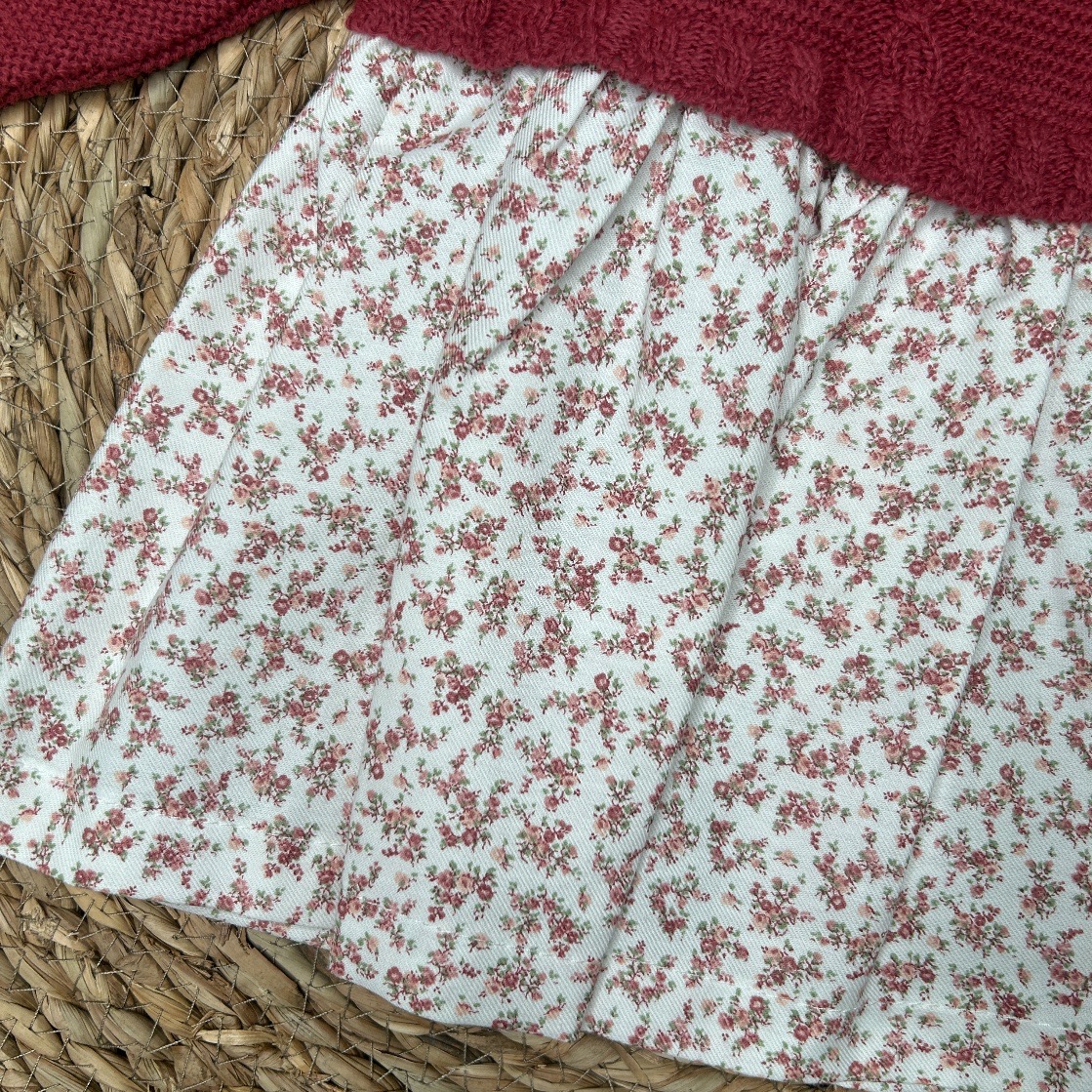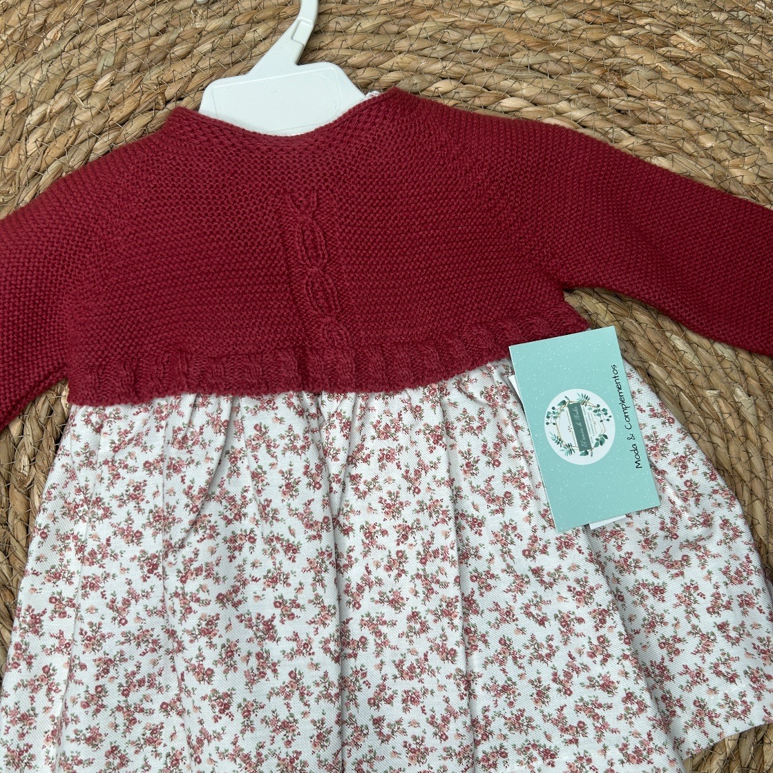 Jesusito de dos piezas con braguitas, cuerpo de lana en burdeos y falda estampada de flores en burdeos.