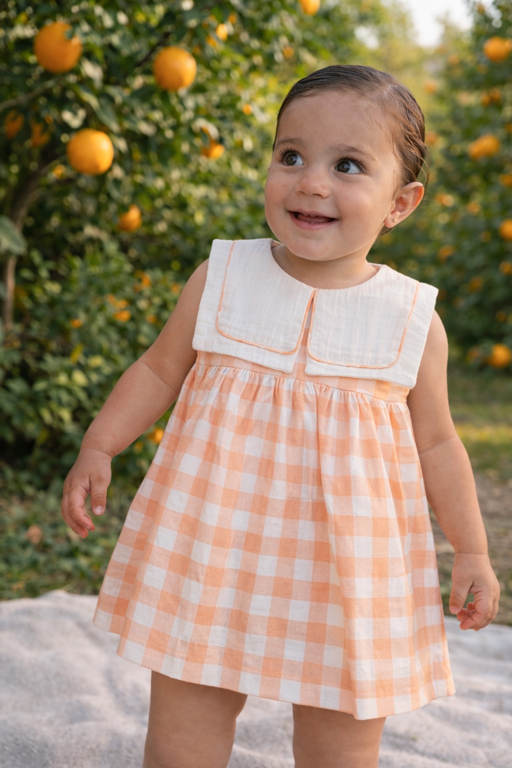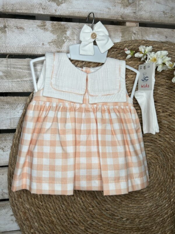 Jesusin para bebé confeccionado en tejido vichy en tono melocotón y blanco, ideal para la temporada primavera y verano.