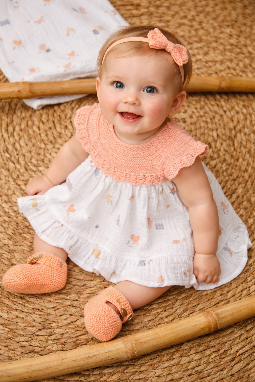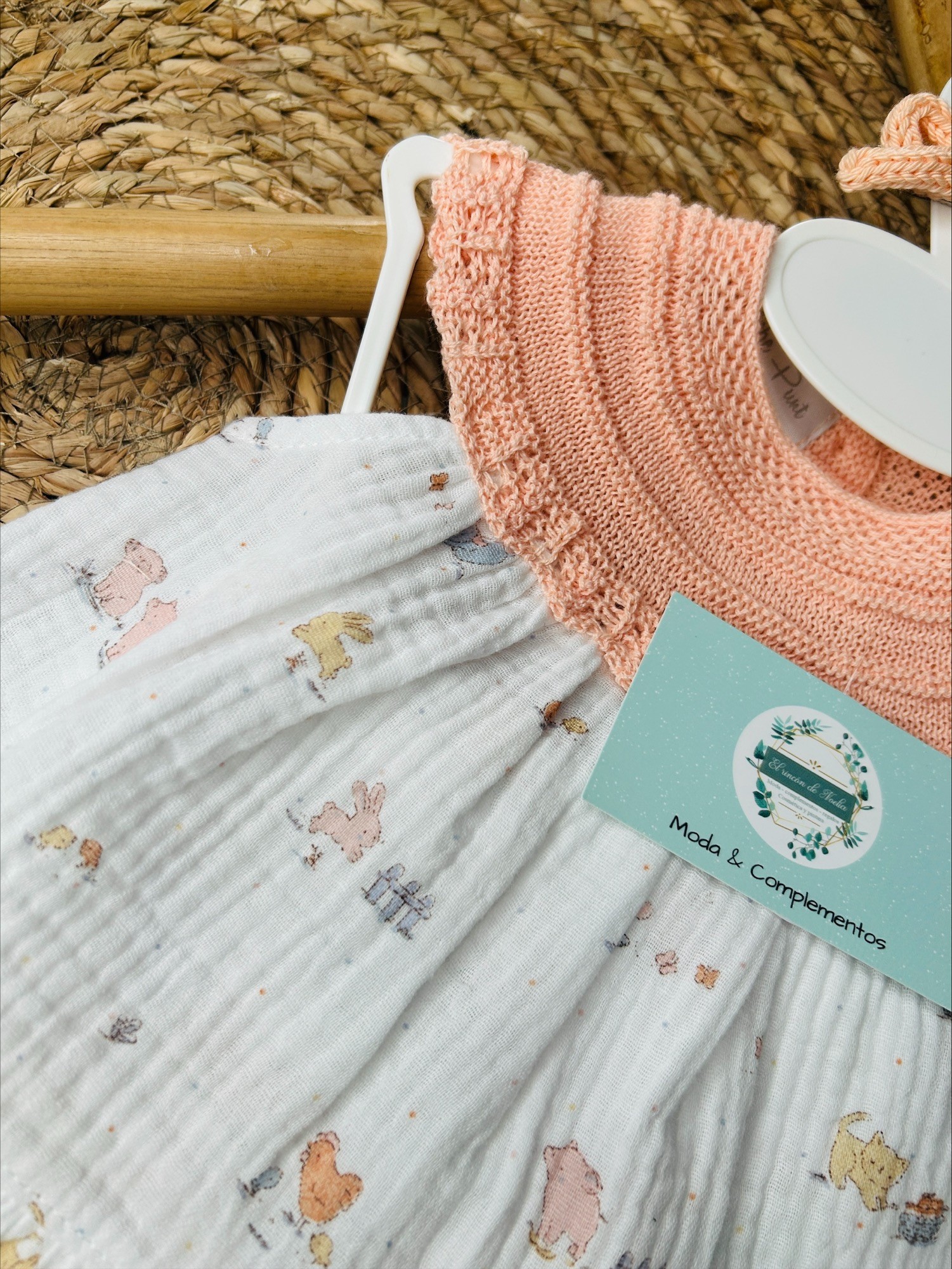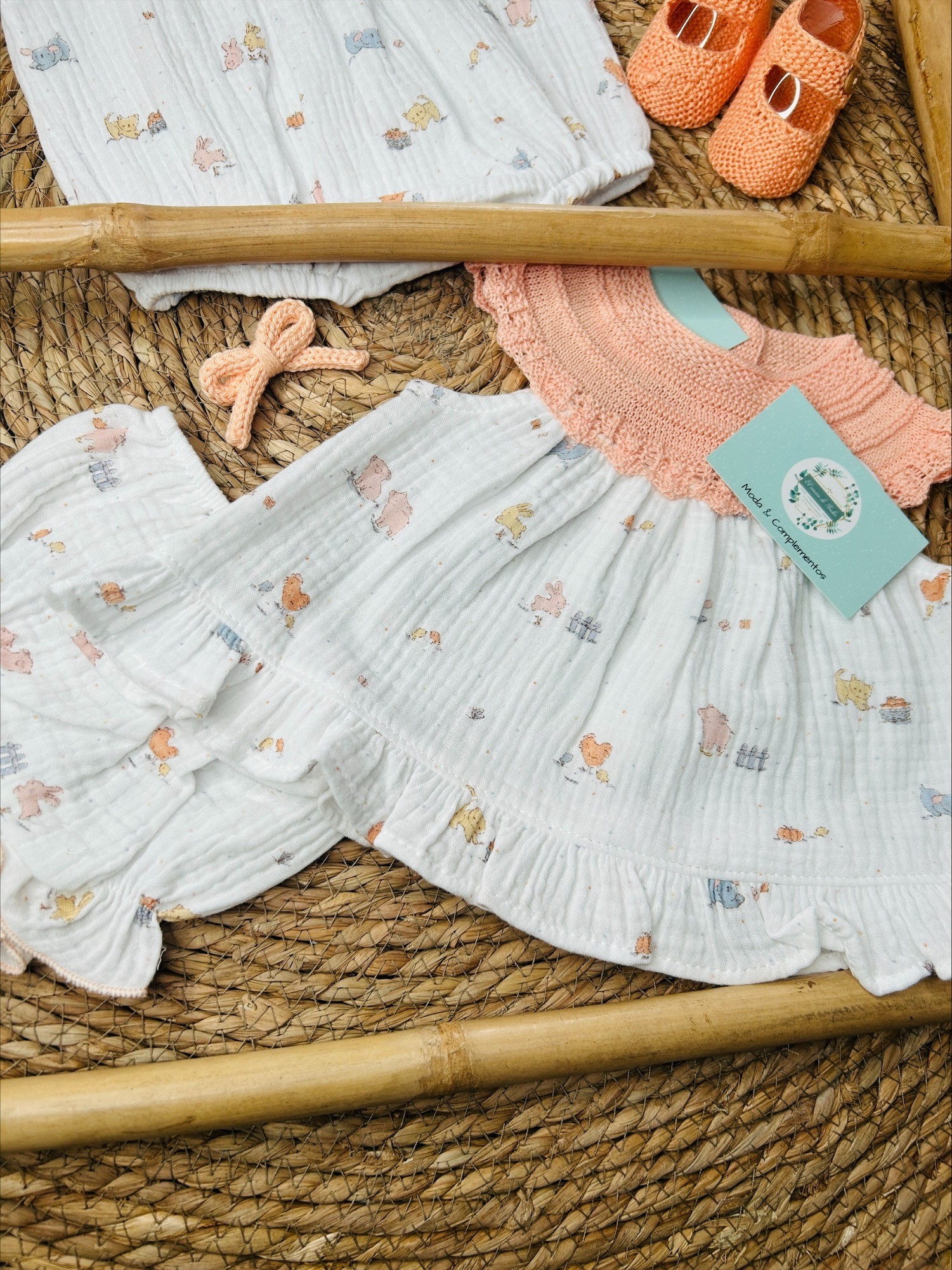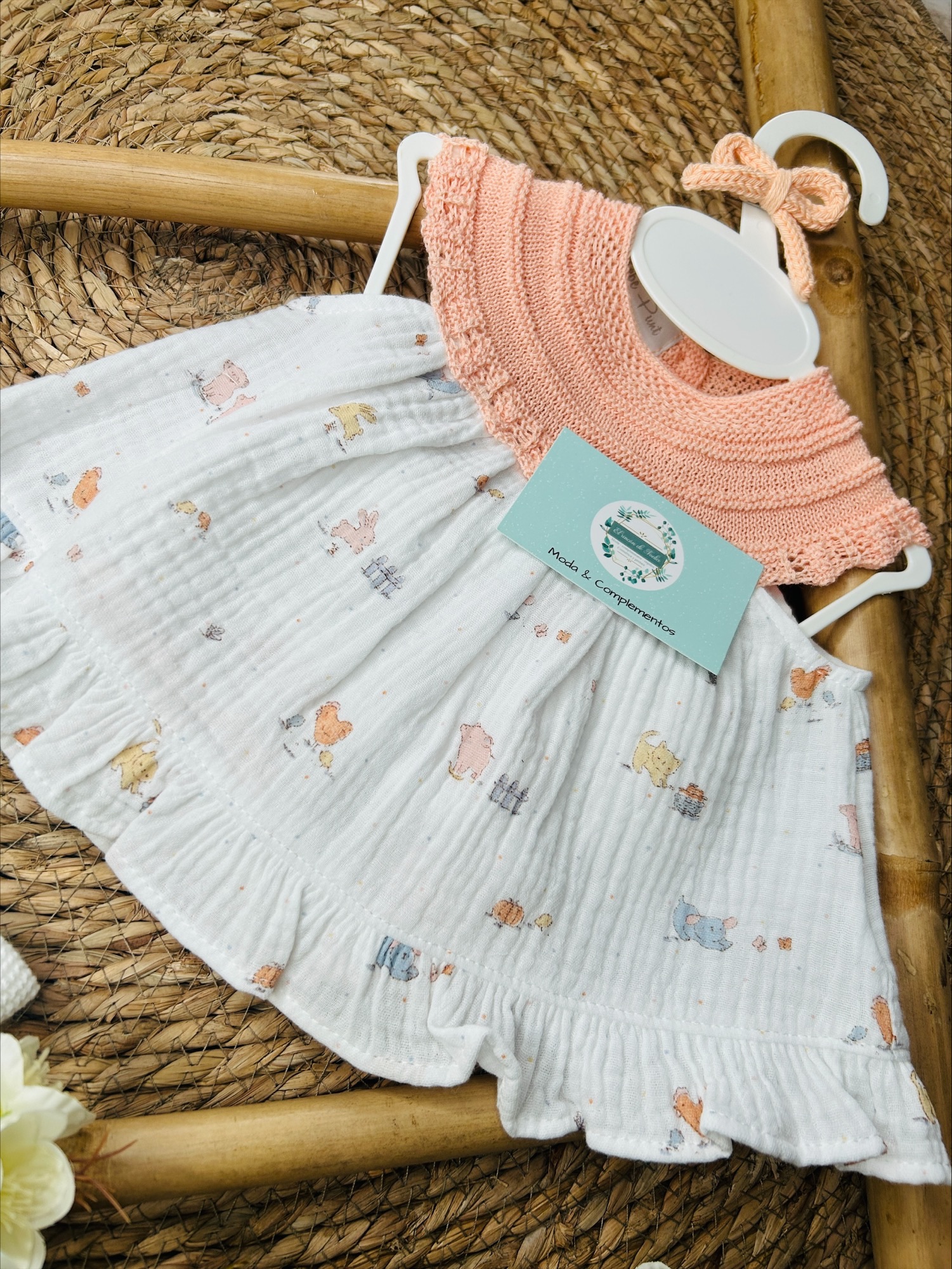 Canesú de punto en color mandarina  y falda estampada con fondo blanco, volante en el bajo.