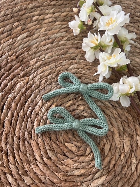 Lazo con cordón realizado a mano con pinza en color verde empolvado .