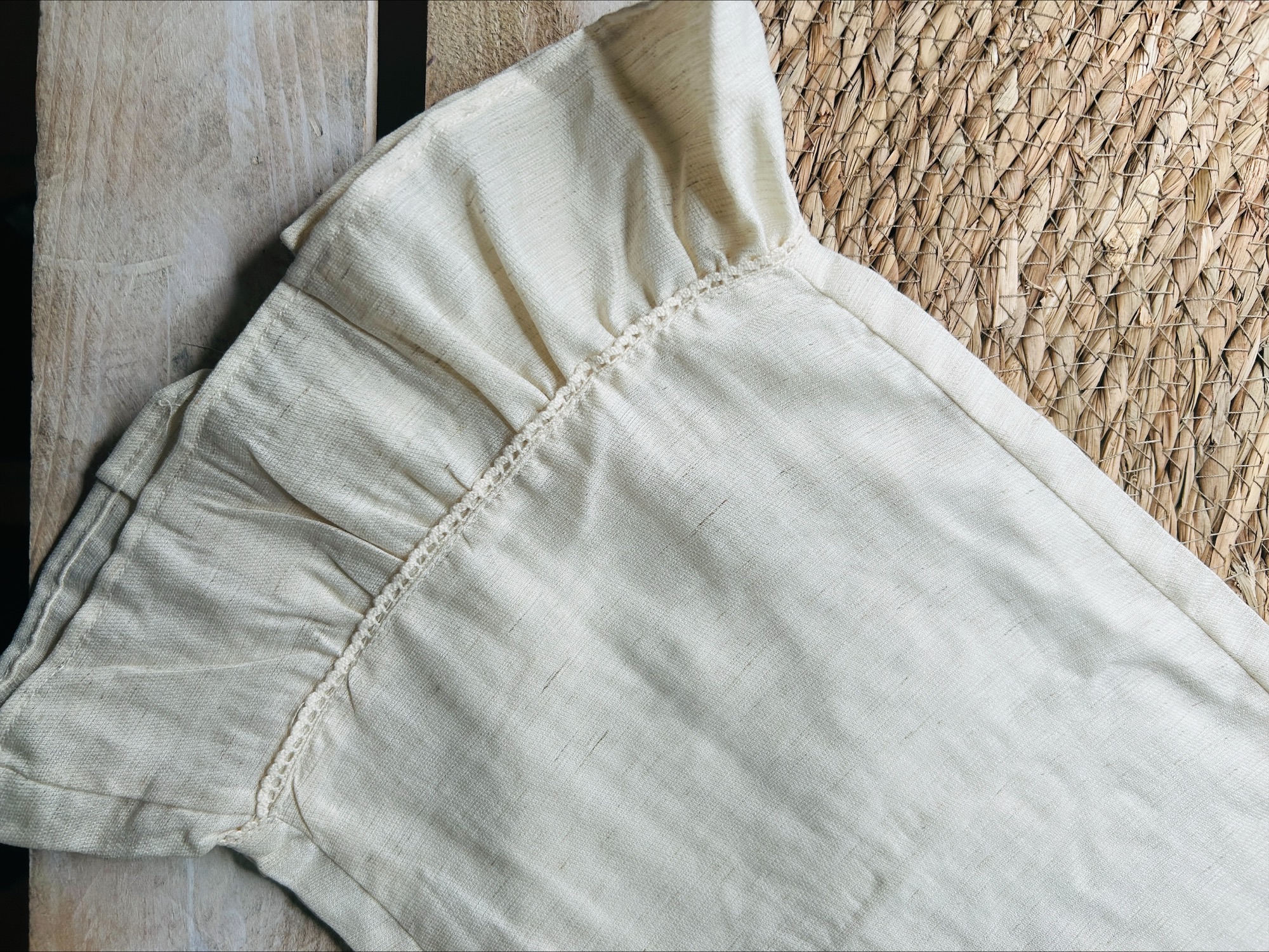 Pantalón de lino en color beige de pata ancha con volante en el bajo.