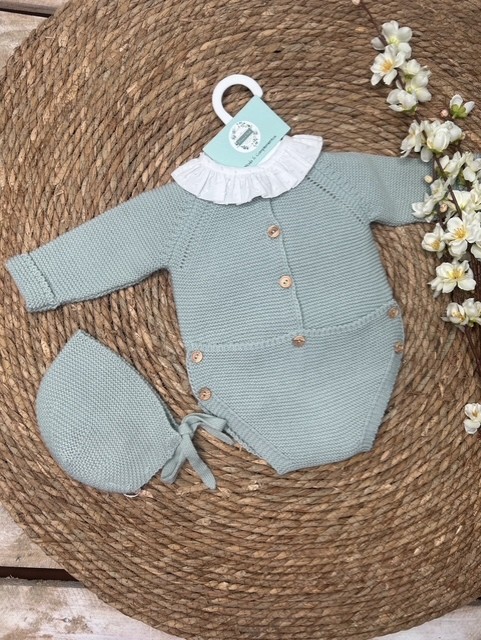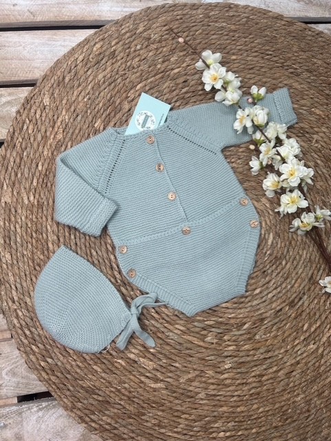 Pelele de lana en color verde grisáceo con botones de madera en la parte delantera.