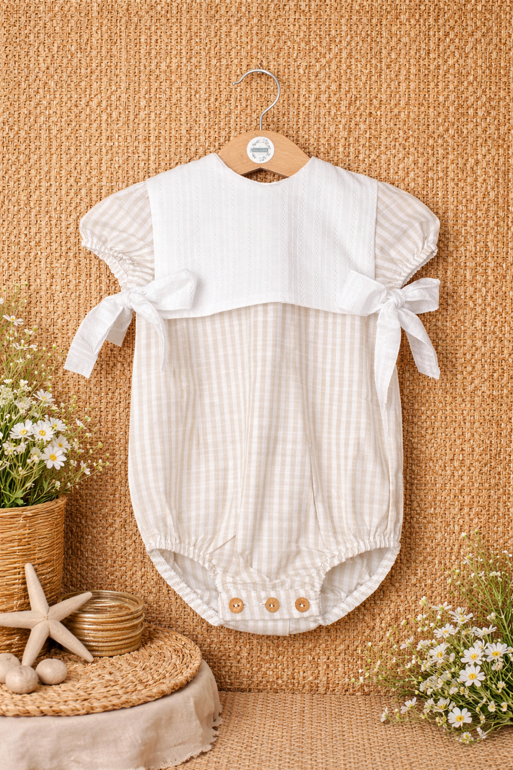 Pelele de bebé en delicado tejido de rayas verticales en tono arena, perfecto para los días de primavera y verano. Destaca por su elegante cuello babero blanco con textura bordada, que aporta un toque clásico y muy dulce.