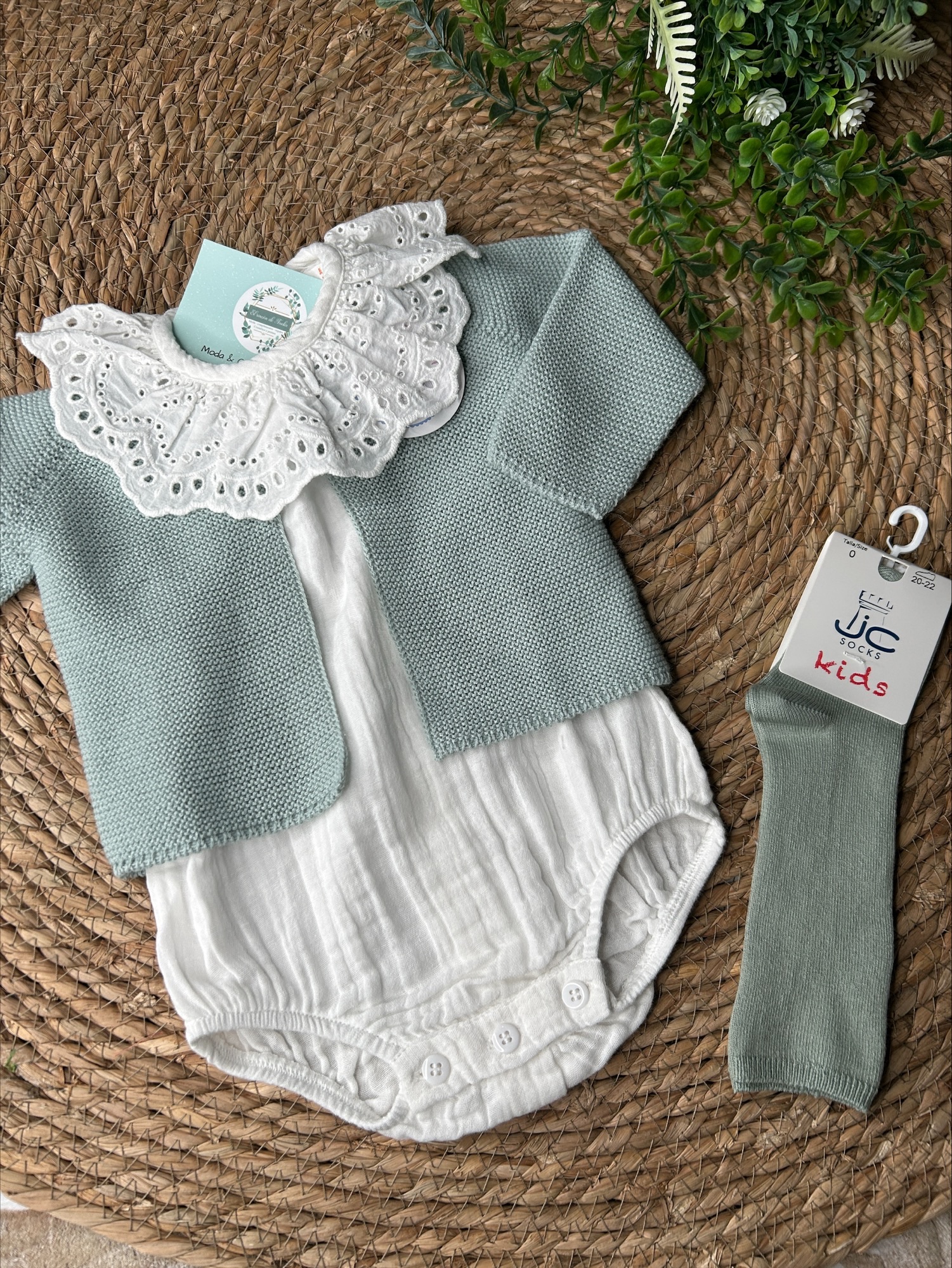 Pelele en bambula en color blanco, con cuello perforado del mismo color.