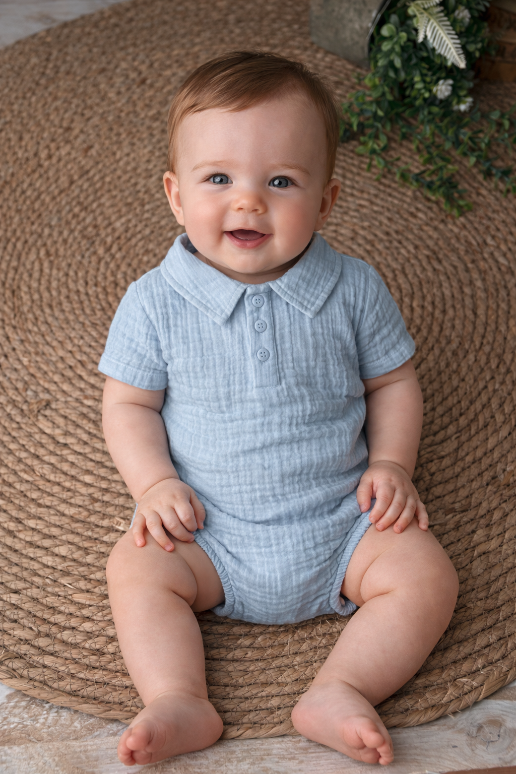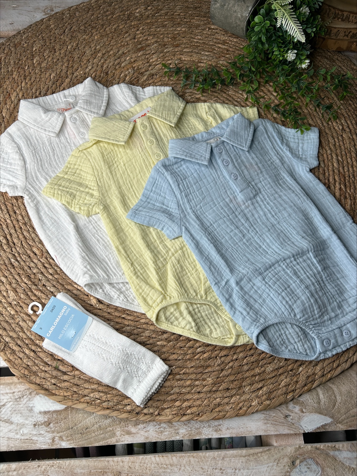 Pelele de bambula con cuello tipo polito. Botones en la parte trasera. Ideal para combinar con calcetines altos.