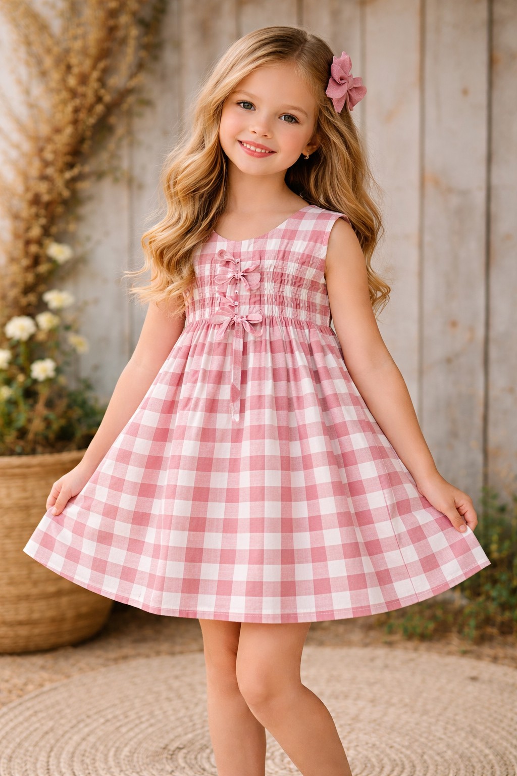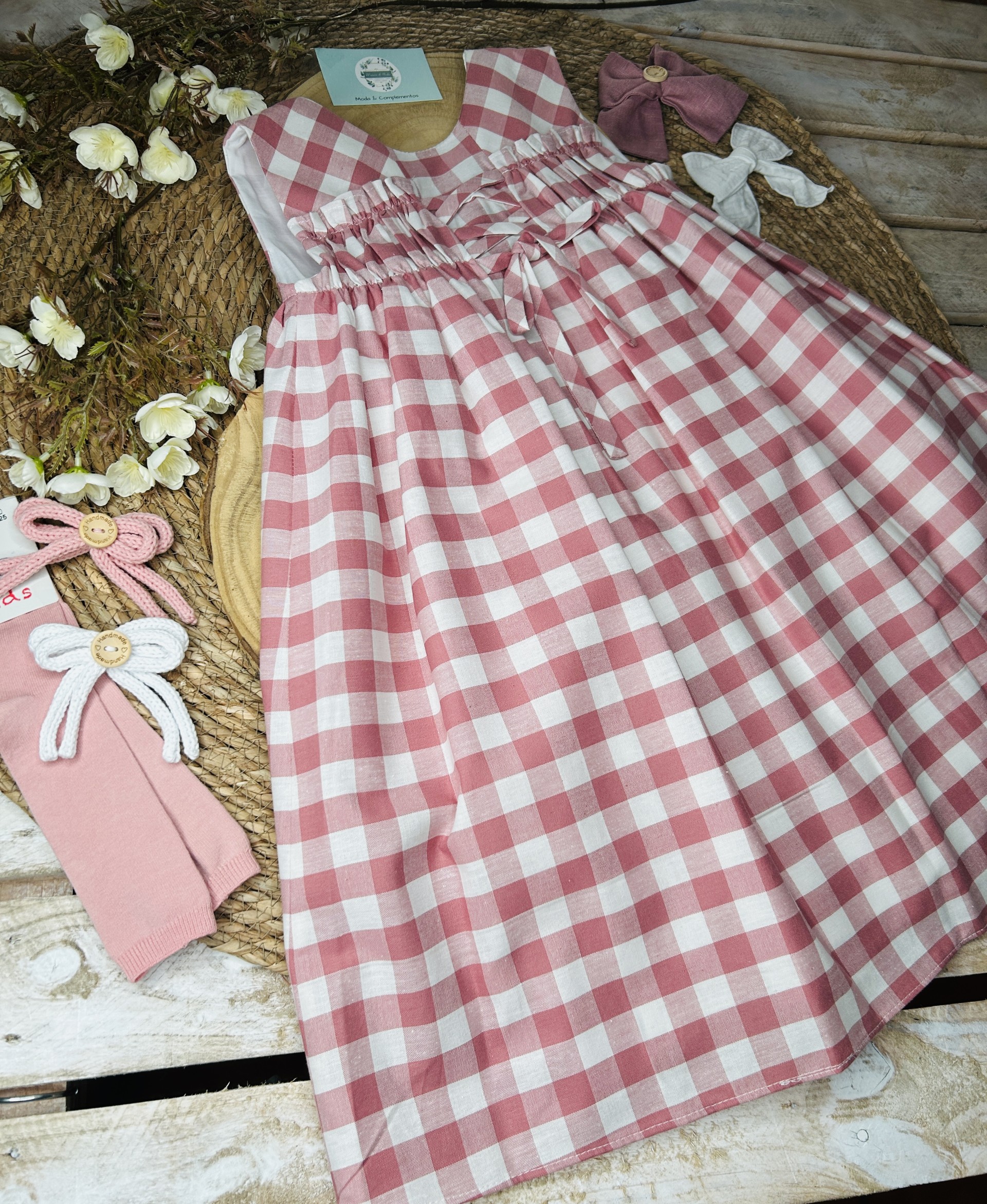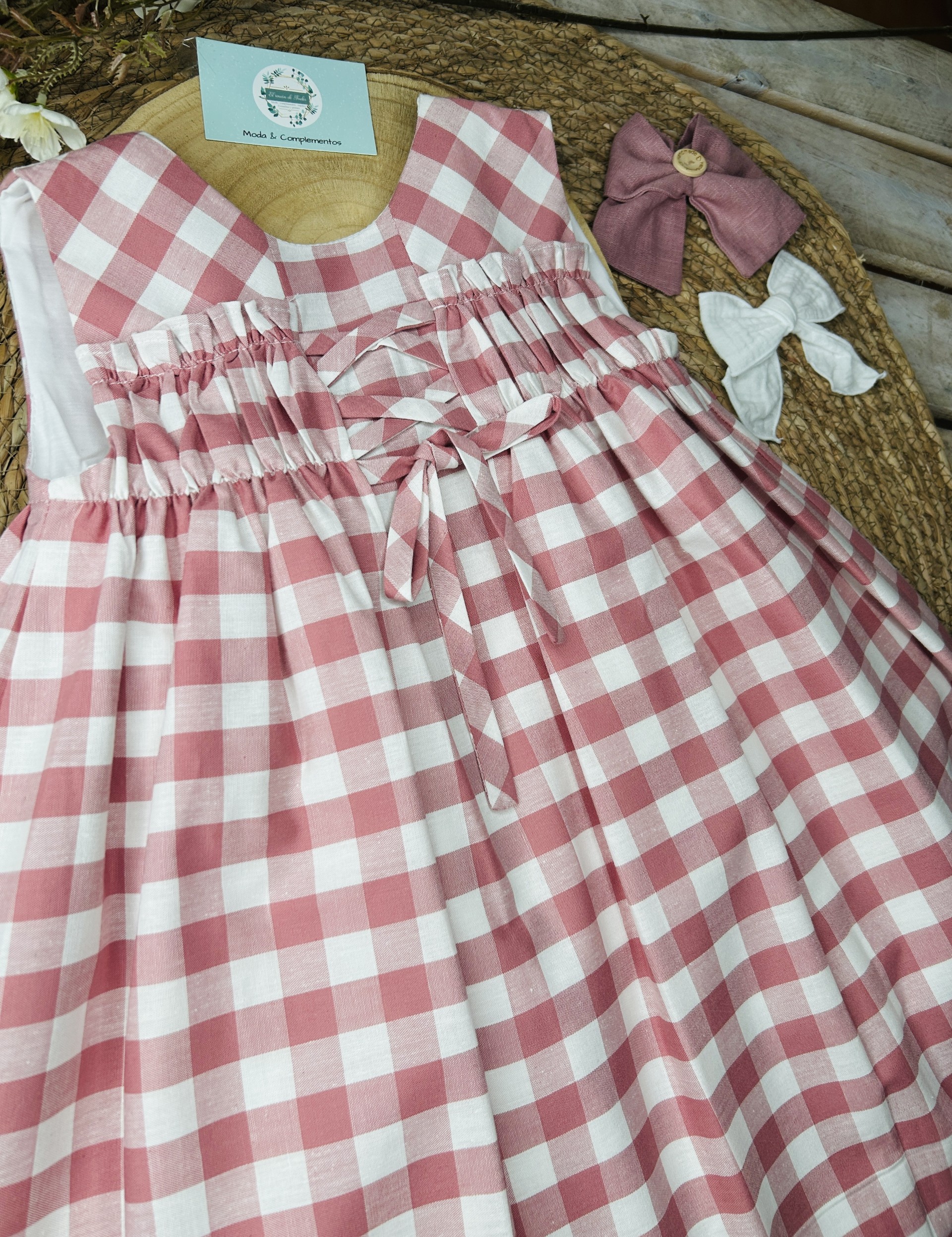 Vestido infantil en cuadros vichy rosa maquillaje y blanco.