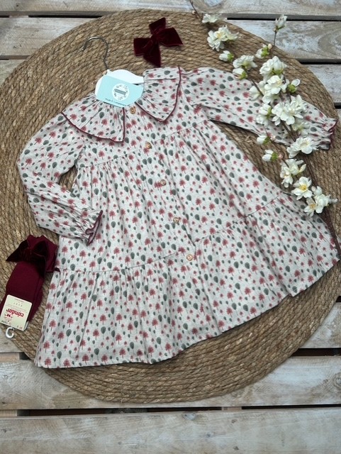 Vestido de manga larga con estampados. Cuello volante con ribete burdeos, botones de madera y volante en el bajo.