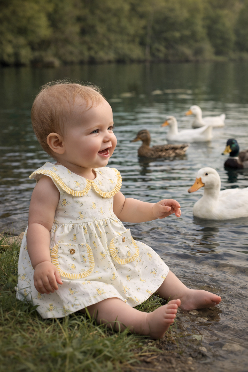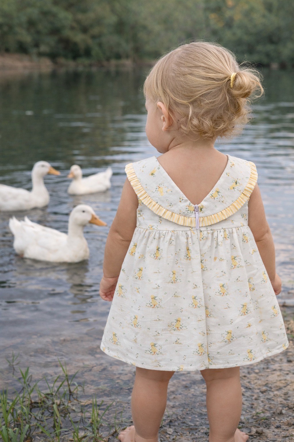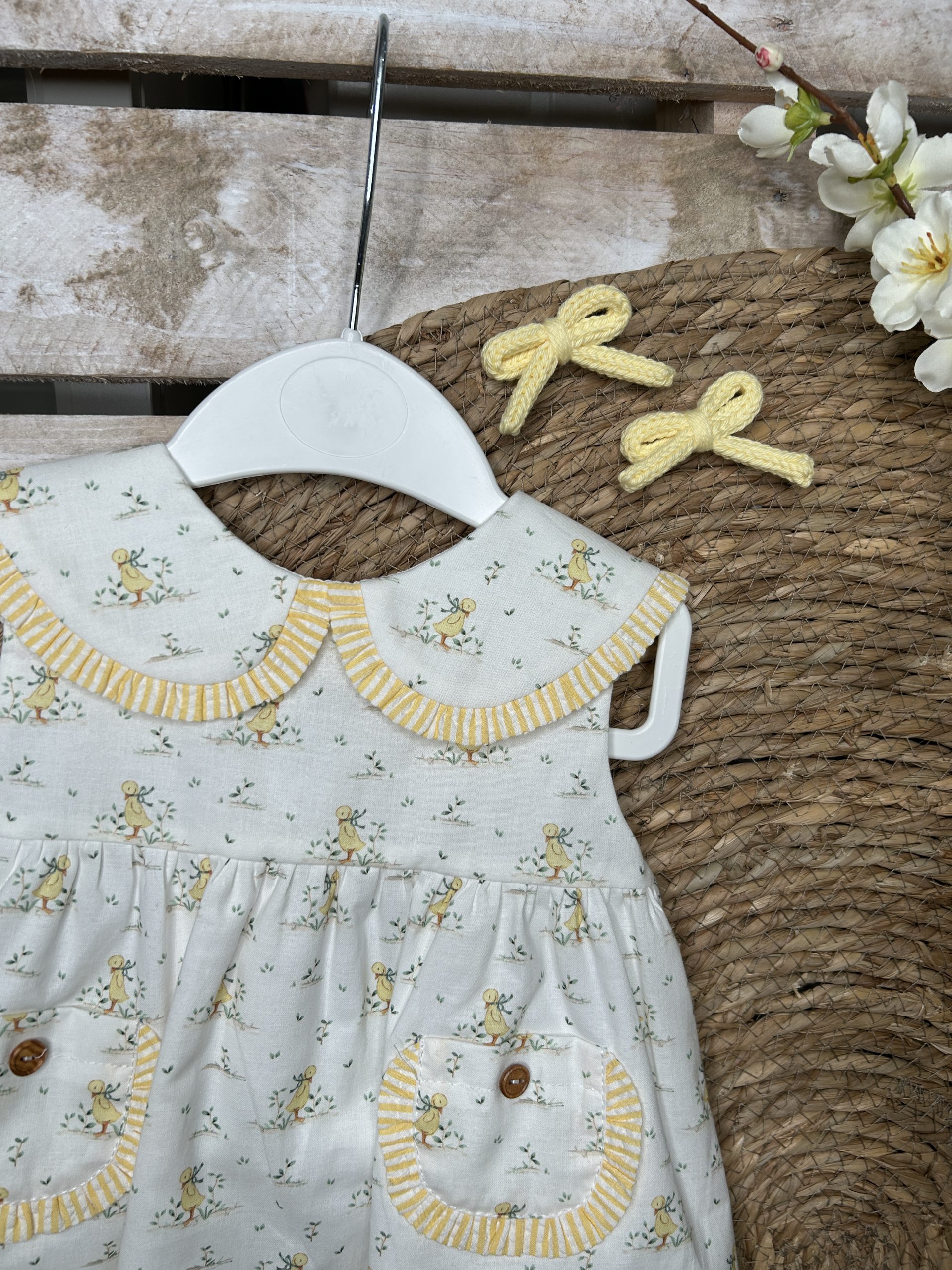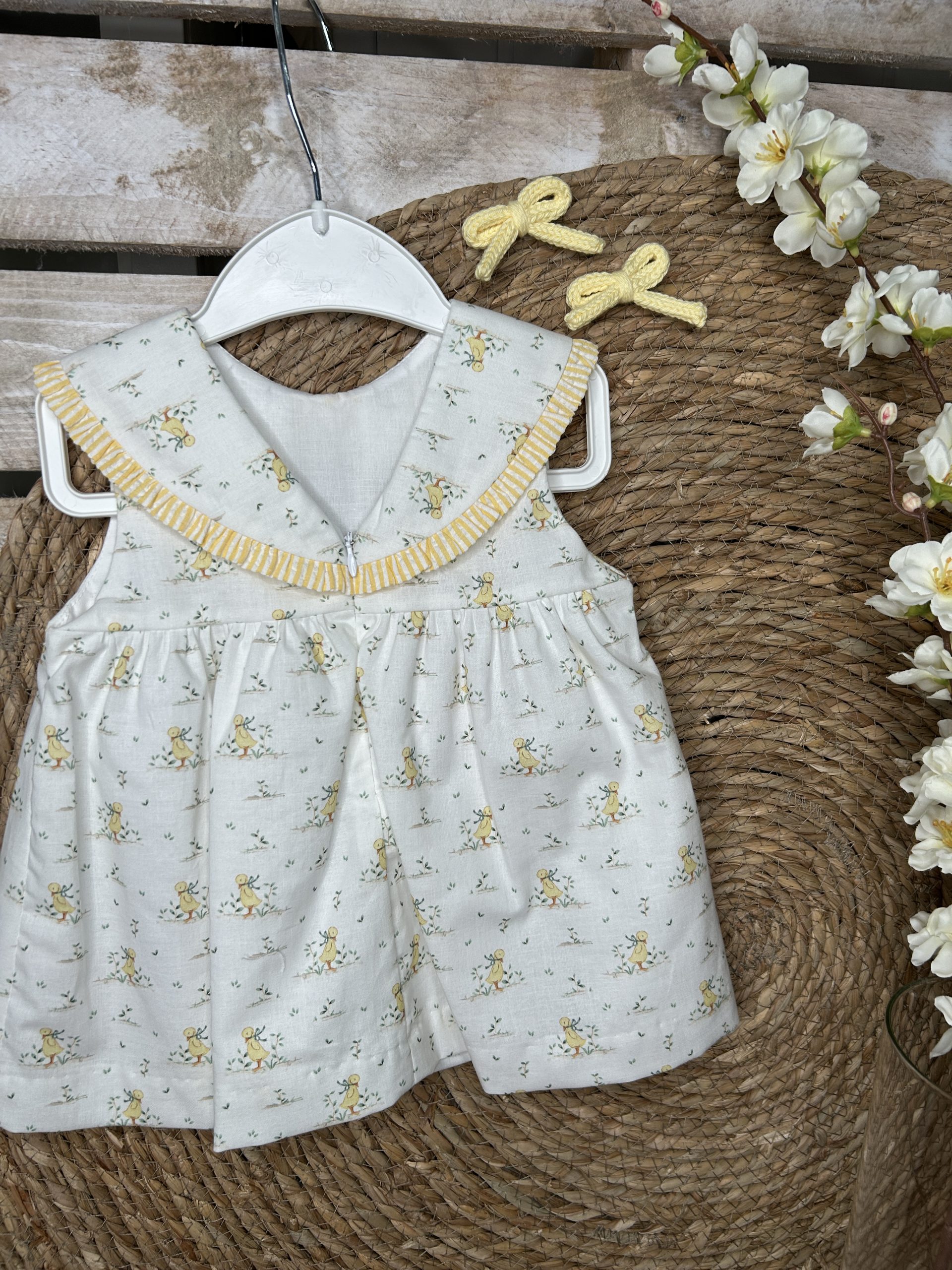 Vestido infantil sin mangas en tejido suave y ligero con delicado estampado de pequeños patitos en tonos suaves.